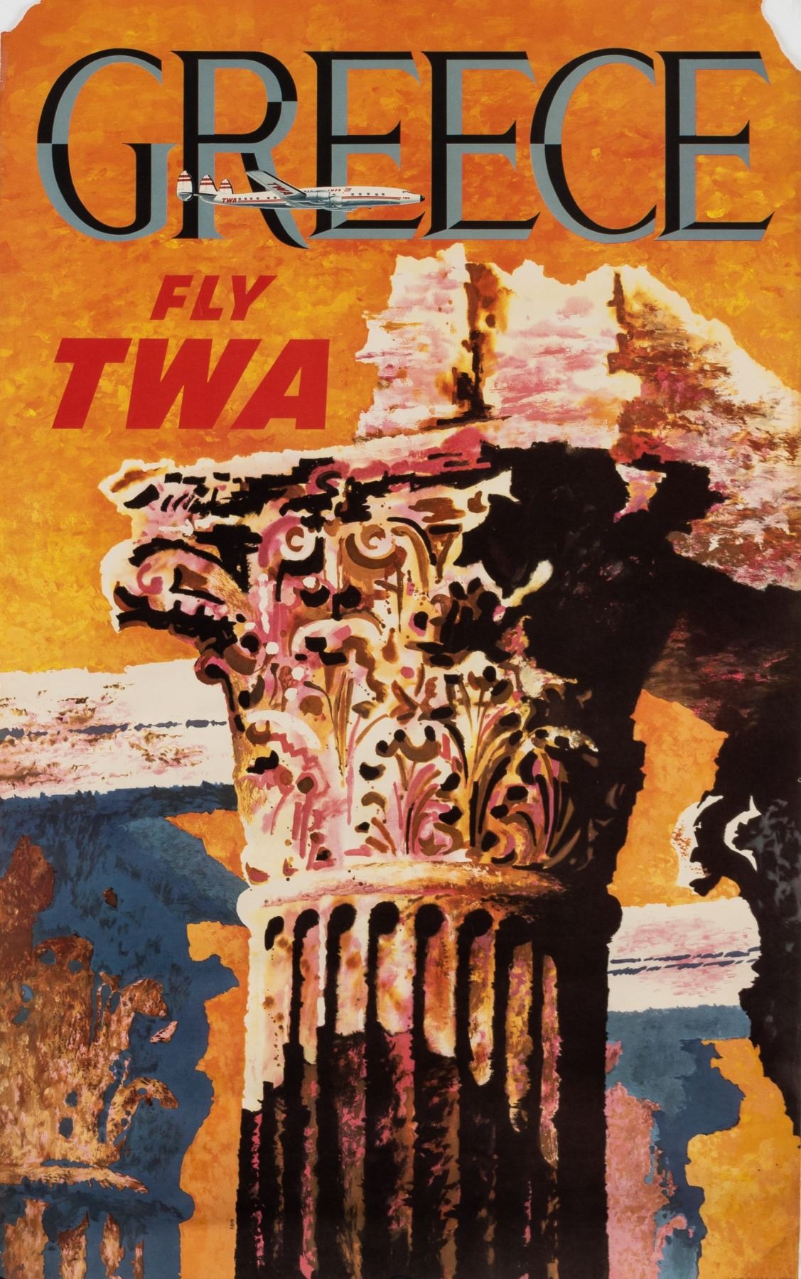 'Greece - Fly TWA', artwork by David Klein, (1918-2005), Trans World Airlines, 1950s, 40 x 25 inches. Loss of both top corners, minor tears on left edge, and creasing on right edge.