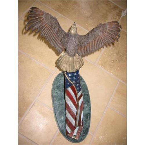 HIGHLY COLLECTIBLE AND HIGHLY BEAUTIFUL FOR EAGLE LOVERS. THE EAGLE WITH AMERICAN FLAG BRONZE SCULPTURE IS MAGNIFICENT WORK OF ART. APROX 21X21 INCHES EAGLE AND FLAG. MARBLE BASE IS 16X9 INCHES. SIGNED BY RENZO. HOWEVER, WHEN WE PURCHASED, THE REAR SCREW ON THE BOTTOM WHERE THE FLAG AND EAGLE HOLDS WAS MISSING. NOW IS HOLDING WITH A CLIP AND SCREW WITHOUT THE BOLT AND IS HOLDING FINE. VERY HEAVY ABOUT 40 POUNDS. THE SCULPTURE IS IN A VERY GOOD SHAPE. THE BASE , USUAL WEAR AND TEAR AND BARELY VISIBLE. THE SCULPTURE WILL BE SOLD AS IS. EXCELLENT ACCENT PIECE ON TOP OF EXECUTIVE DESK OR A HOME OFFICE DESK ACCESSORY.