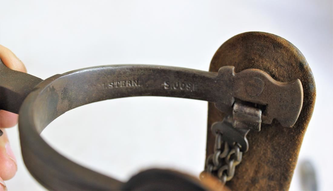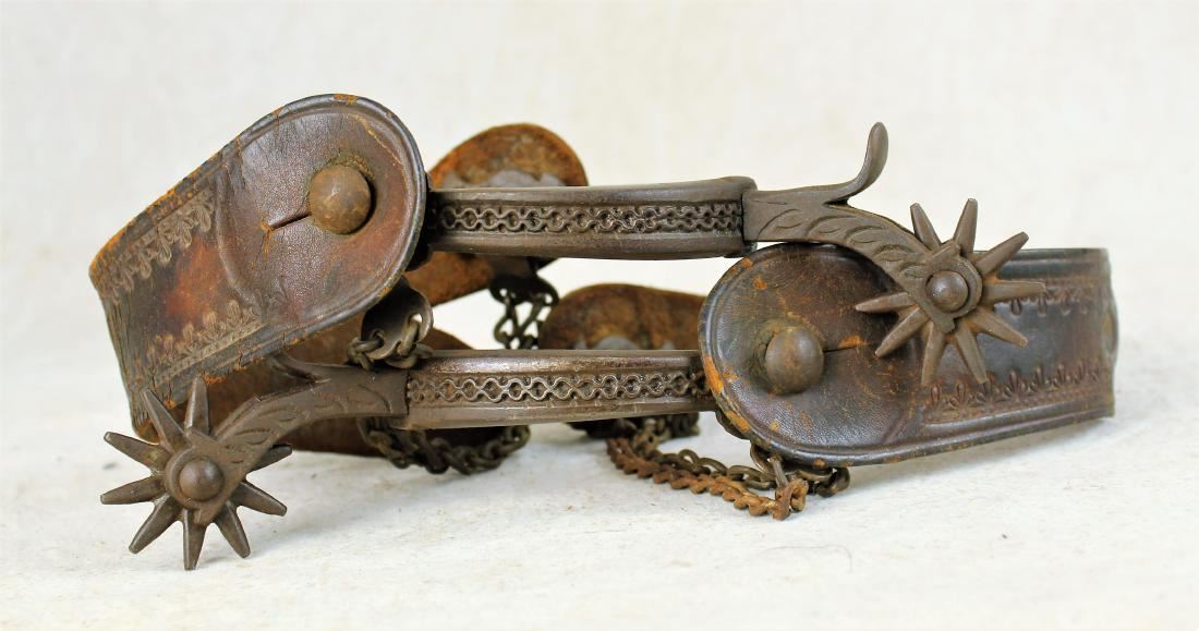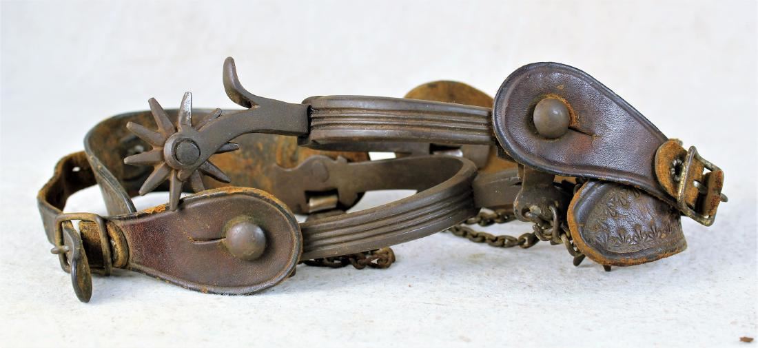 Very scarce iron drop shank spurs with decorative maker marked chased heelbands and terrific original straps.