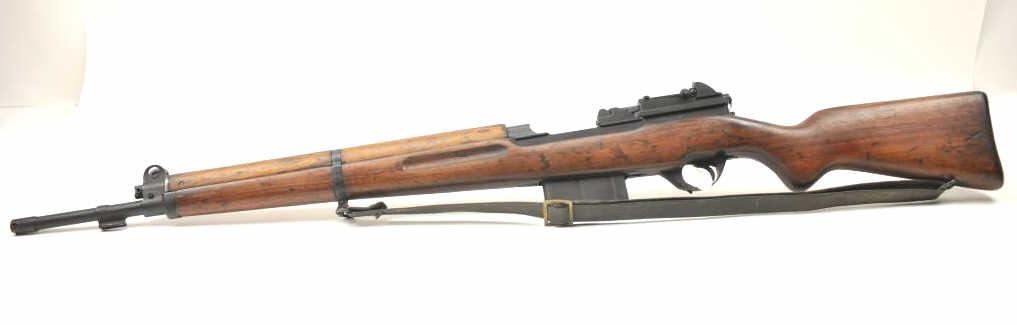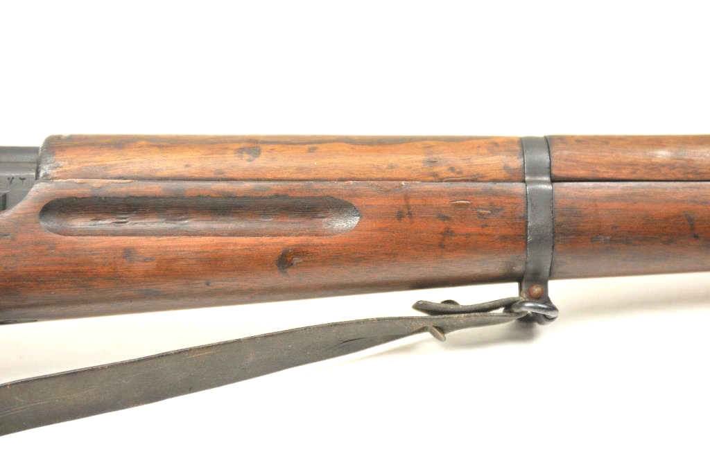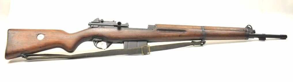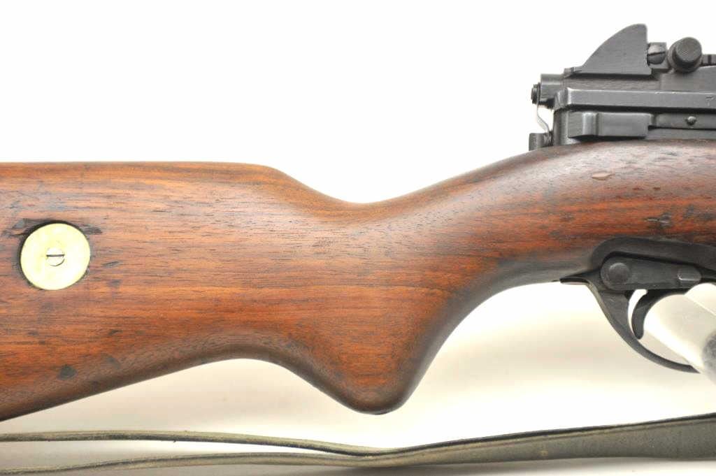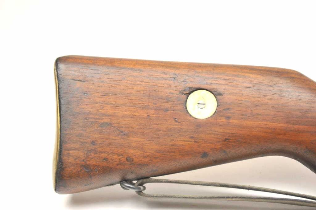 FN 49 semi-automatic rifle, 8mm caliber, Serial #35076. The rifle is in fine overall condition with a 23” import marked barrel with a protected blade front and military tangent style rear sights. The rifle retains nearly all of the military finish with an Egyptian crest and text on the front ring. The smooth wood stock is in very good condition with handling marks consistent with service use. There is a blank brass disc in the right side of the butt stock, sling swivels and a period leather military style sling. The bore is fair and the action functions well on this Belgian made FN 49. Est.: $600-$1,200. (C+R).