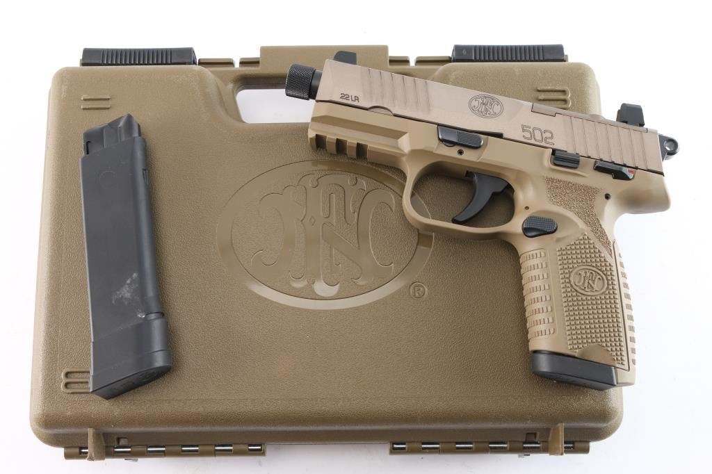 German made rimfire pistol with the size and style of the service type FN pistols, imported by FN USA Columbia SC. Features FDE slide, matte black controls and FDE polymer frame, 4.5" barrel with thread protector double action trigger with exposed serrated ring hammer, ambi manual frame mounted safety, ambi slide stop, ambi push button mag release, tall dovetail mounted sights, rear sight mounted on a blank plate to fill the slide's optic cut. Bore is pristine. Retains 98% finish . Includes factory hard plastic box, manual, several optic plates with rear sights attached, two 15 round magazines.