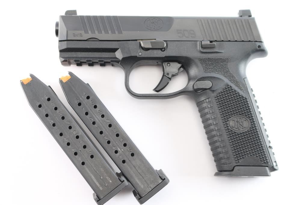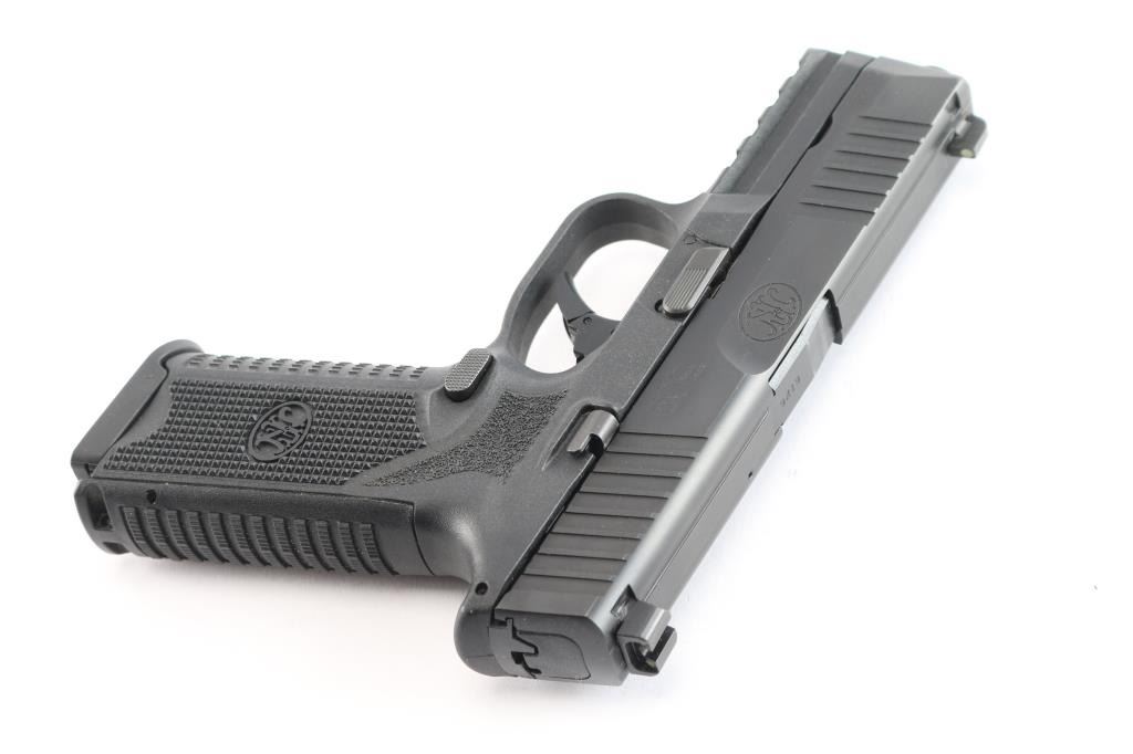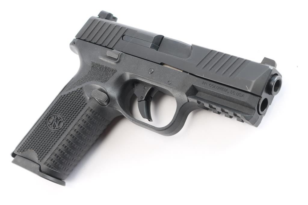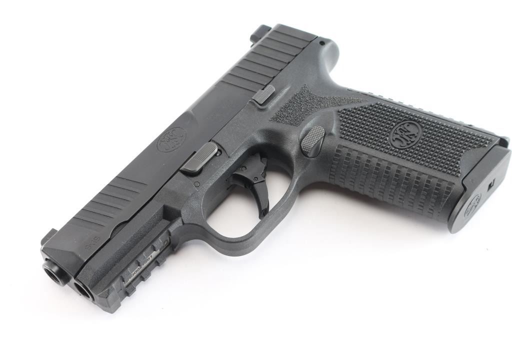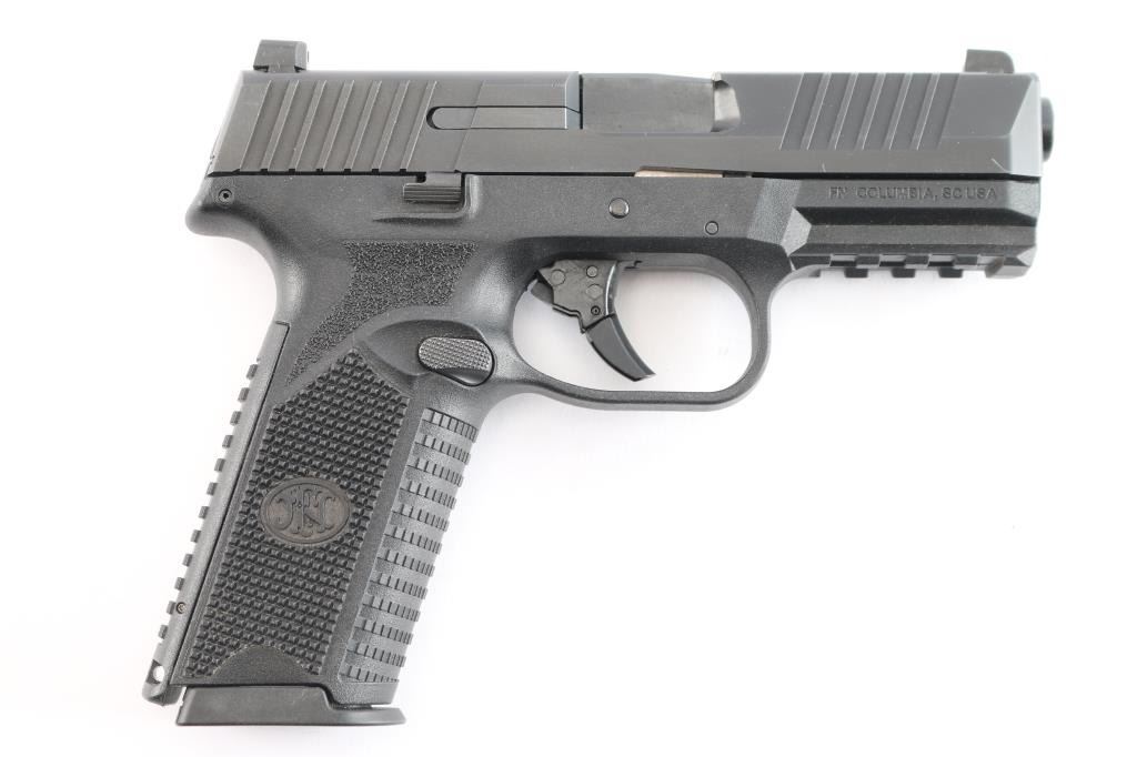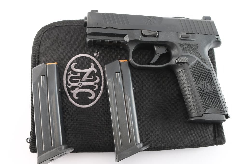American made semi-automatic striker-fired full-sized pistol chambered for 9x19mm, manufactured in Columbia, SC. Pistol features a black polymer frame, a 4" cold-hammer-forged barrel with a target crown, dovetailed fixed blade front sight with a luminescent white dot, dovetailed square notched rear sight with two luminescent white dots, smooth two-part safety trigger, checkered ambidextrous magazine release, no manual safety, dual recoil spring assembly, interchangeable backstraps, picatinney rail on dust cover, front and rear slide serrations, serrated take-down lever, serrated an ambidextrous slide stop, and black polymer grip with stippling and checkering on the grip panels. The slide was given a matte black finish. The approximate black slide finish retained is approximately 99% with nothing remarkable. Metal displays no rust or deformation. The action is smooth and crisp, and the polymer is excellent. Bore is bright with strong rifling. Pistol includes original factory cardboard box with end label, soft case, two extra backstraps, lock, owner's manual, and three seventeen-round magazines.