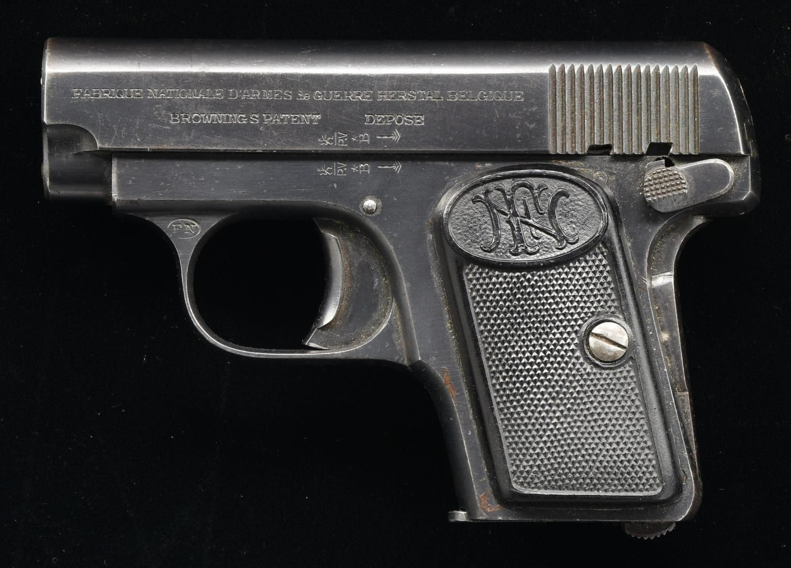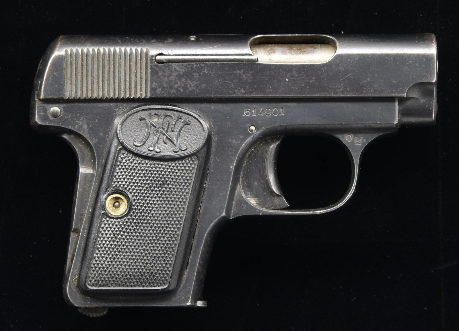Cal. 25 ACP. S# 614901. Low profile fixed sights. Belgian pistol mfg. 1919-1940. Blue finish. Pistol has FN markings & Belgian proofs. Black checkered grips w/ FN logo. MAGS: 1-6 rd. CONDITION: grips show some dings, handling marks & light chips. Metal retains much original blue but shows overall oxidation & freckling. Very good bore. (23-5204/MJC). CURIO. $275-375.