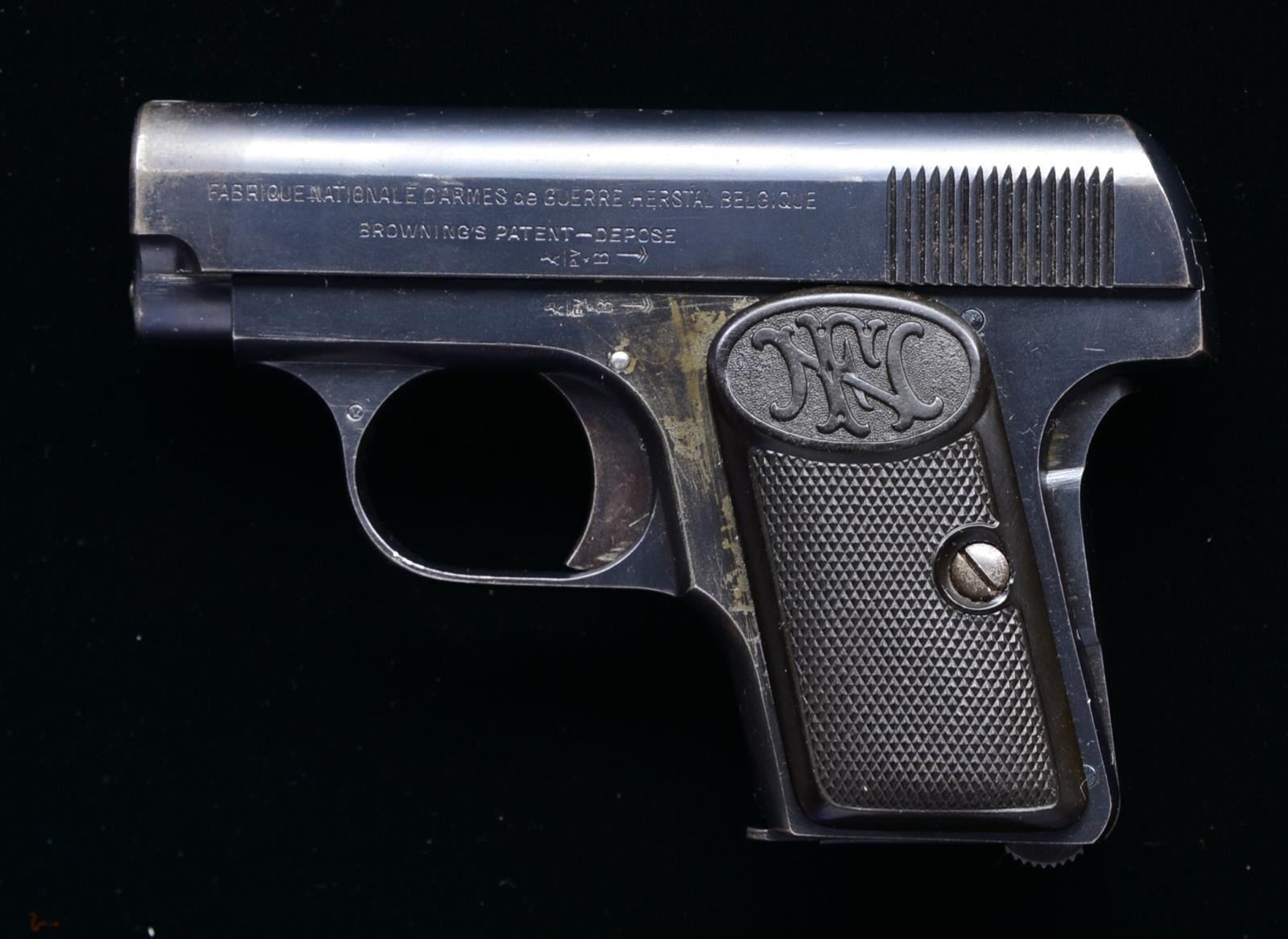 Cal. 6.35mm (25 ACP). S# 72201. Bbl. 2". Blue finish. 2 Piece checkered black plastic grips. MAGS: 1 detachable 6 rd. CONDITION: over 80% dull lightly faded blue. Grips show light wear. Lightly pitted bore. (20-3207/DS). CURIO. $400-600.