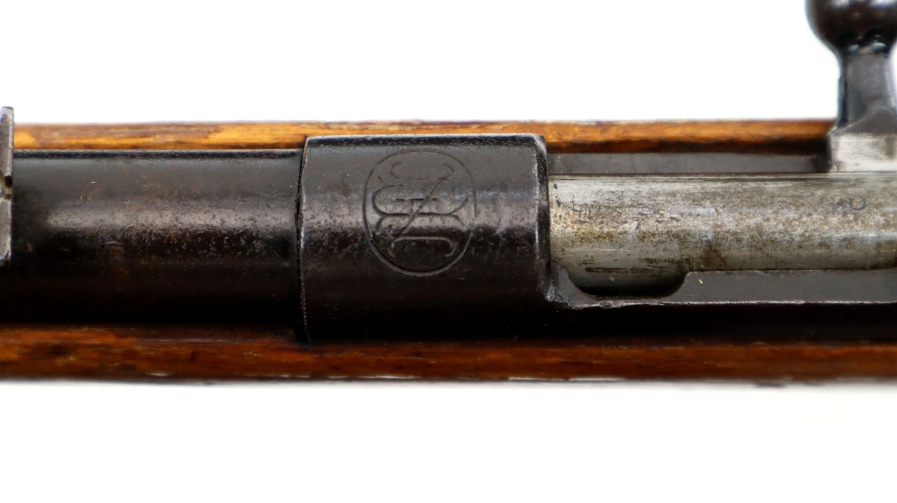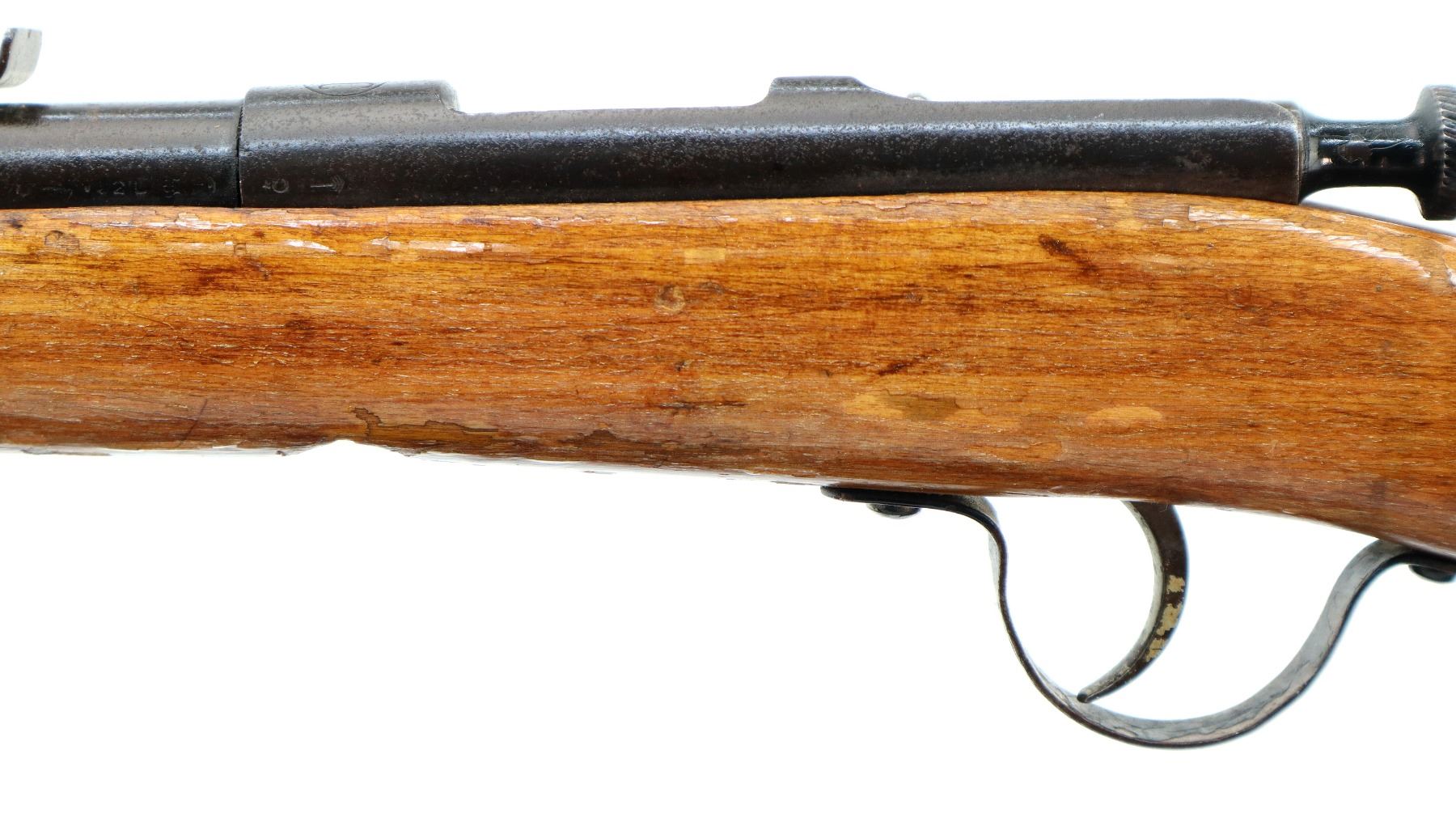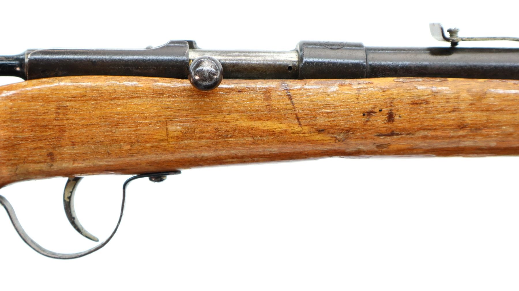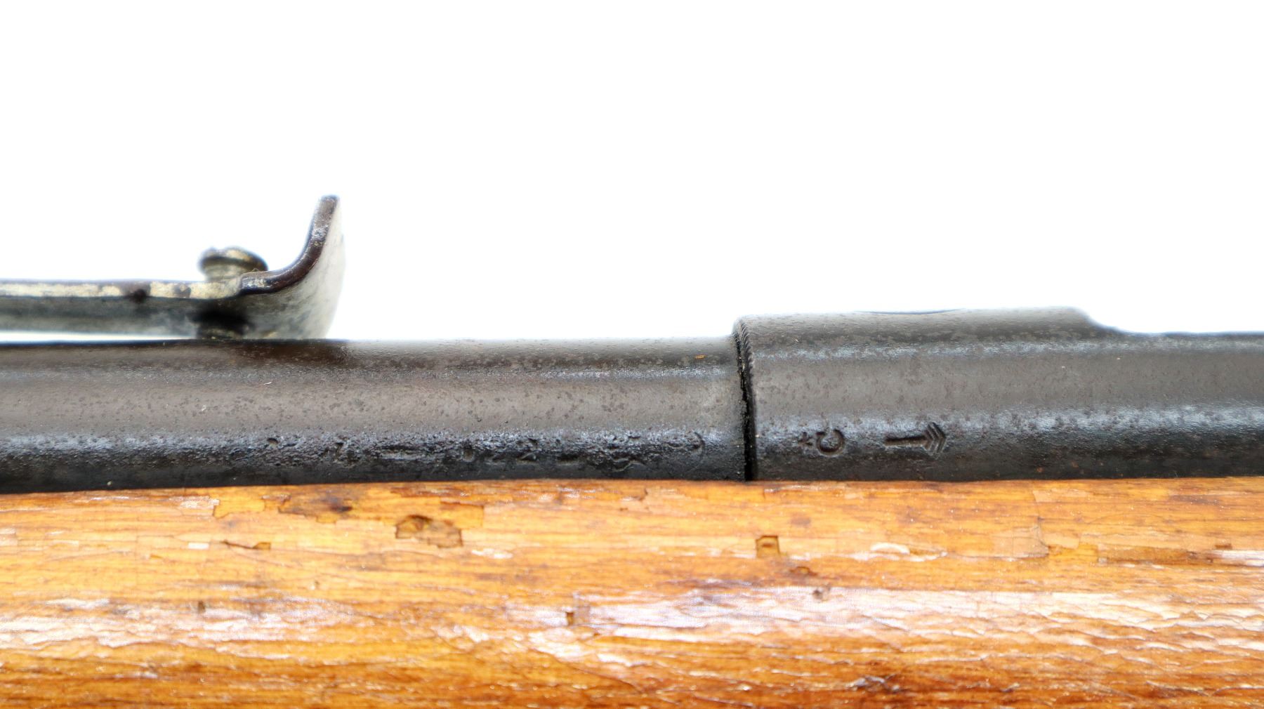 Main Description: Blade front sight, adjustable u notched rear sight, straight bolt handle, extractor is present. One piece replaced wood stock, forearm is chipped, pistol grip, smooth brass butt plate, replaced trigger guard.