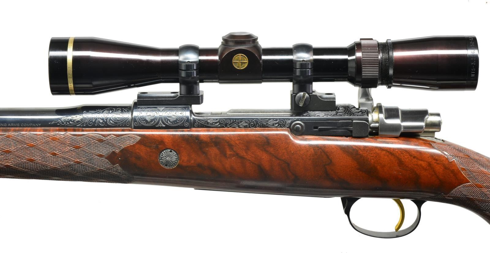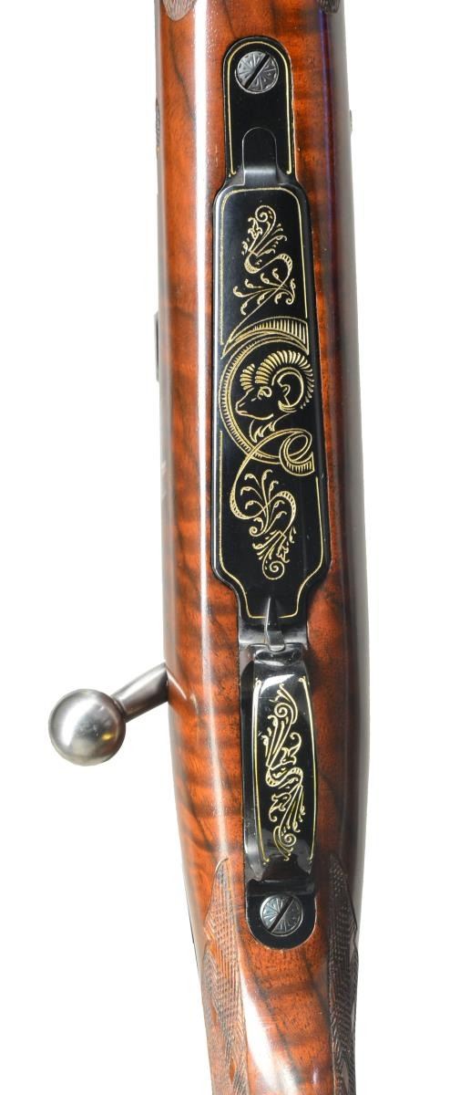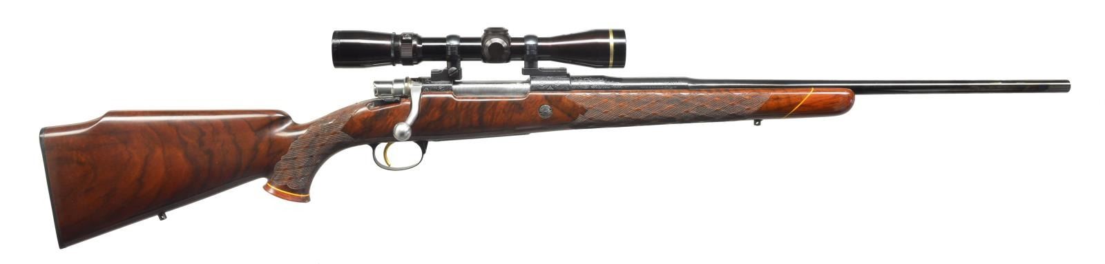 SCOPE. Cal. 30-06. S# 7x44029. Bbl. 22 1/2" light weight marked “BROWNING ARMS COMPANY” on left rear & w/ cal., S#, & “MADE IN BELGIUM” on right. Open scroll engraving extends 2 1/4" along breech end of bbl. Lg. ring FN action has bright polished bolt & alloy bottom metal w/ hinged floorplate. Action is engraved w/ 80% coverage open scroll in normal “Medallion” style. Adj. trigger is gold plated & bottom metal has gold accented scroll engraving surrounding picture of ibex. Stock of nicely marbled European walnut measures 13 3/4" over hard rubber Browning buttplate & features Monte Carlo comb w/ swept right hand cheekpiece, flared grip cap & forend tip of rosewood w/ white wood spacers. Skip line fancy pattern checkering is at grip & around forend. Rifle is fitted w/ Leupold “Vari-X III” 2.5-8X scope w/ duplex reticle in Leupold rings & 2 piece base. CONDITION: very fine collector quality retaining nearly all metal finishes w/ only minor operating marks. Stock w/ nearly all its original varnish w/ a few minor nicks & dings, most notable sm. chip at front of grip cap & 1/2" by 1/4" ding in right side forend checkering. Sharp shiny bore, mechanically good. Exterior finish of scope toning to purple, optically clear. (20-4092/MGM). MODERN. $2,500-3,000.