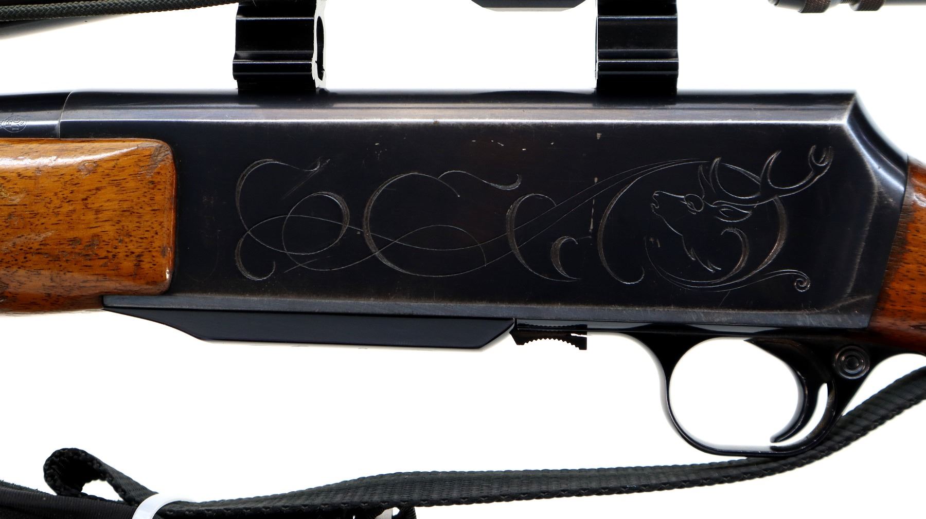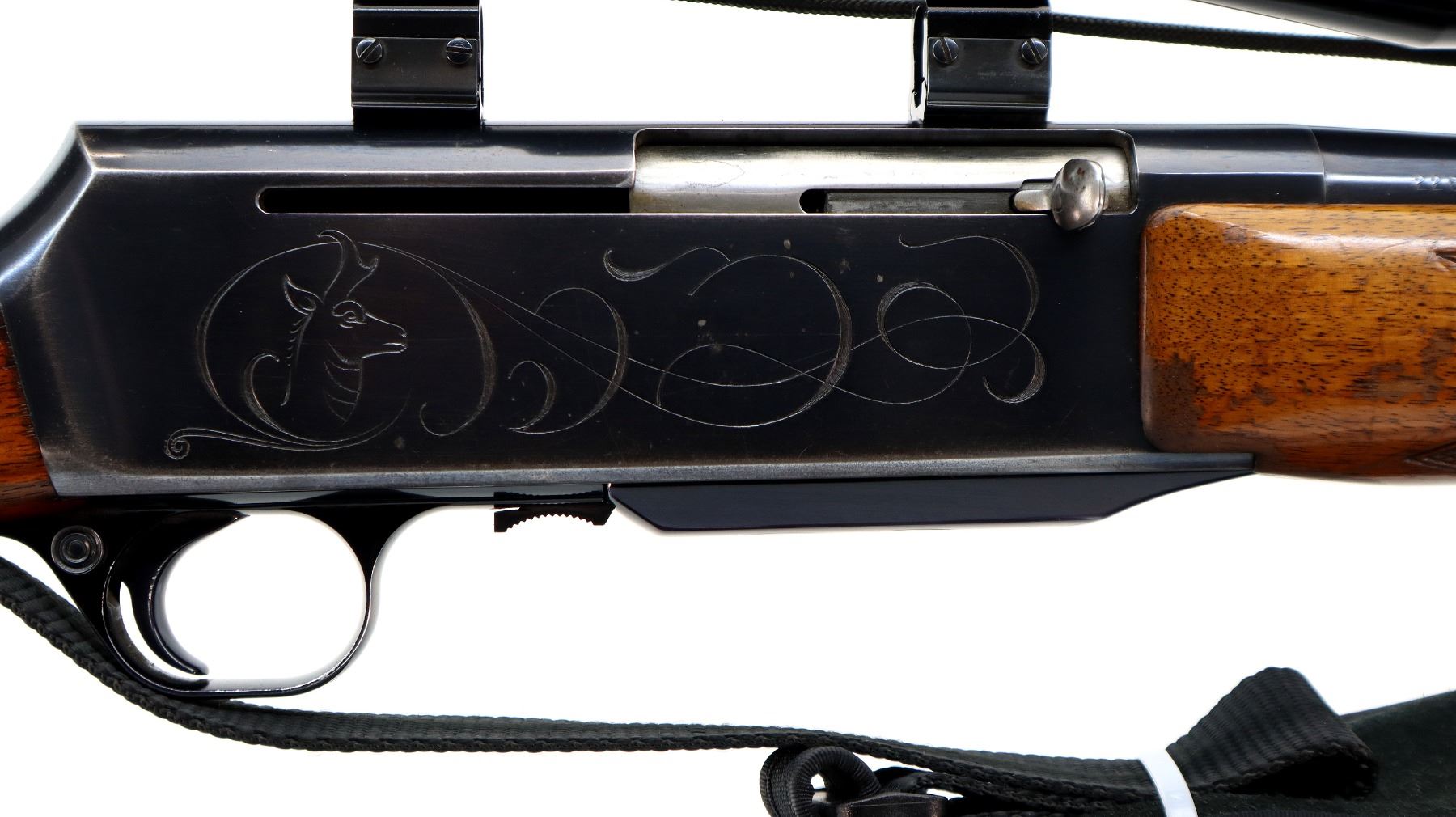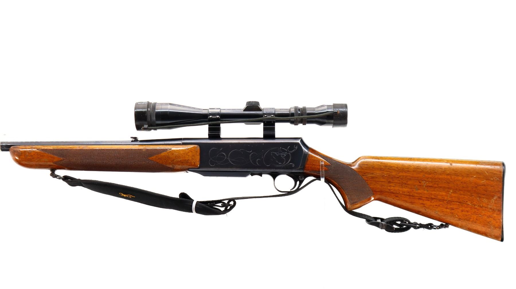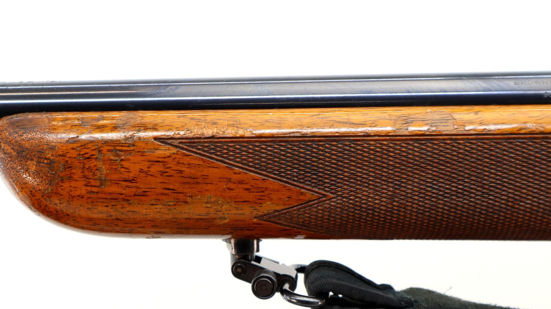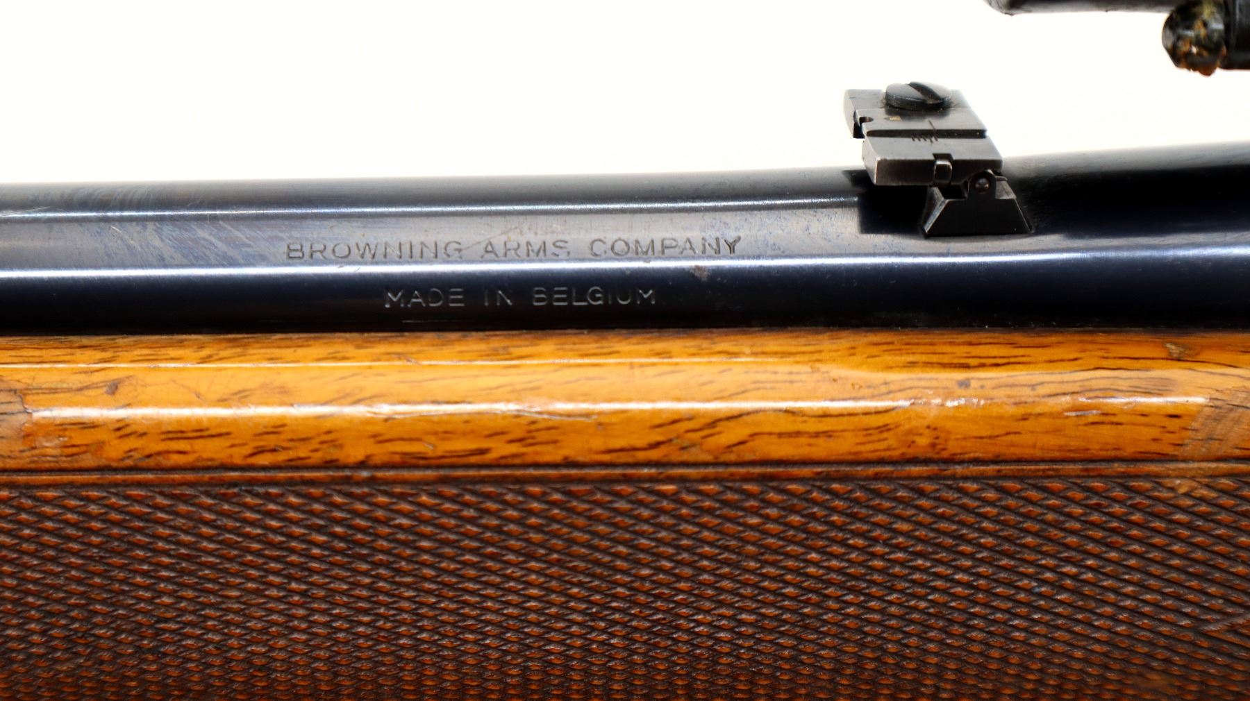 Main Description: Blade front sight with ramp, adjustable folding u notched rear sight, blued finish, engraved receiver drilled and tapped with Weaver V9-II W AO Scope installed, clear optics with duplex crosshair. Two piece wood stocks, checkered forearm and pistol grip, Browning logo black polymer butt plate, sling swivels with black nylon sling.