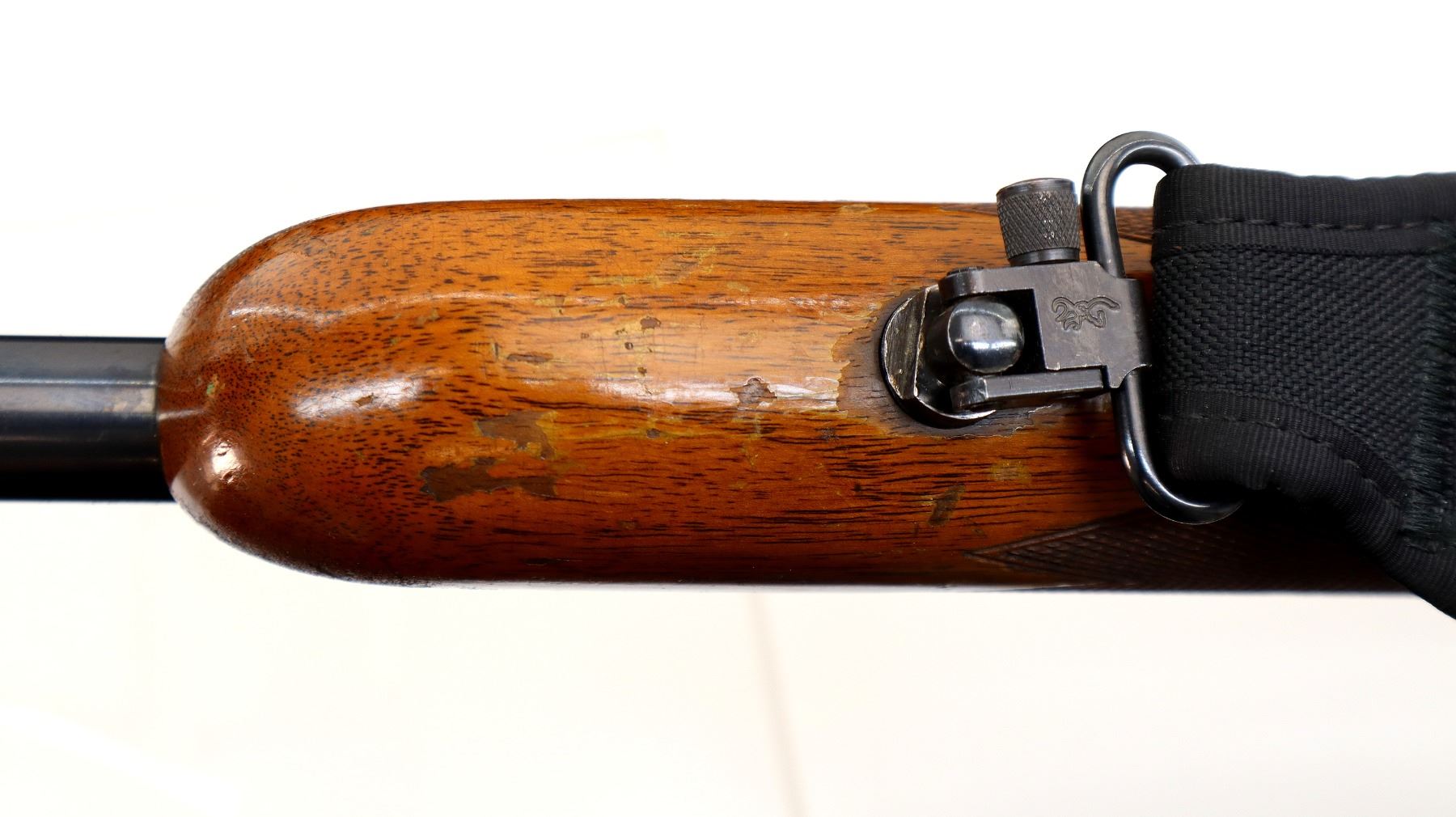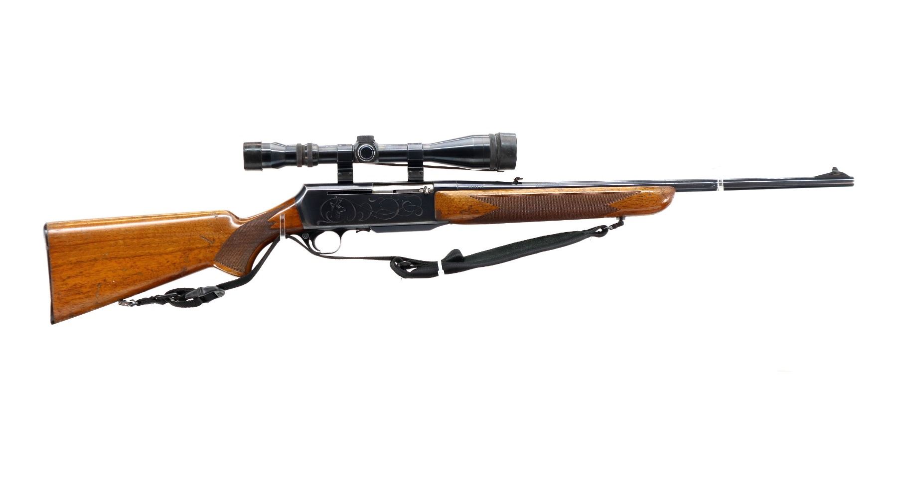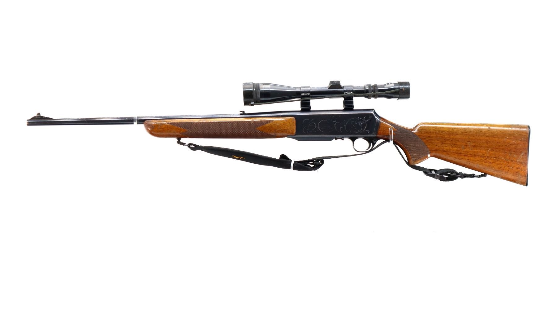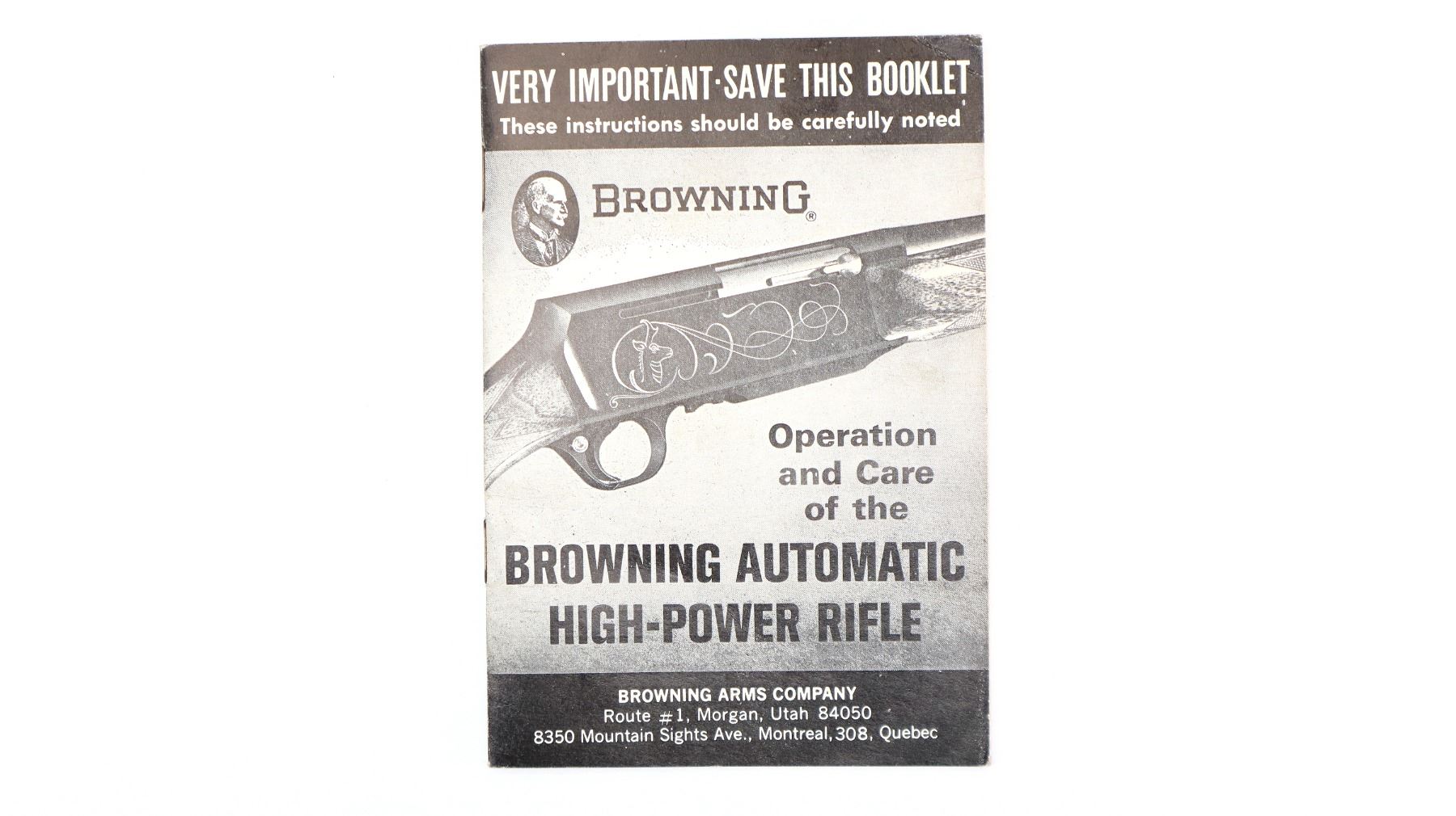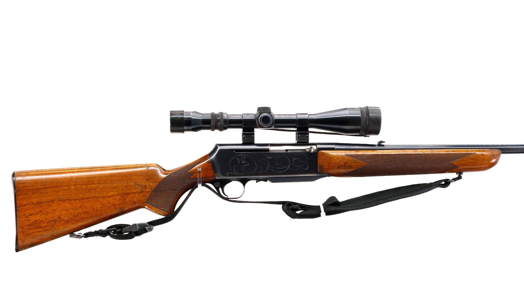 Main Description: Blade front sight with ramp, adjustable folding u notched rear sight, blued finish, engraved receiver drilled and tapped with Weaver V9-II W AO Scope installed, clear optics with duplex crosshair. Two piece wood stocks, checkered forearm and pistol grip, Browning logo black polymer butt plate, sling swivels with black nylon sling.