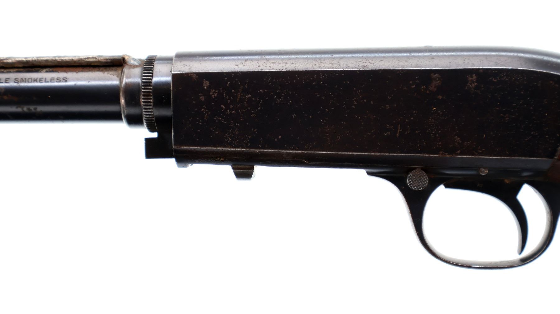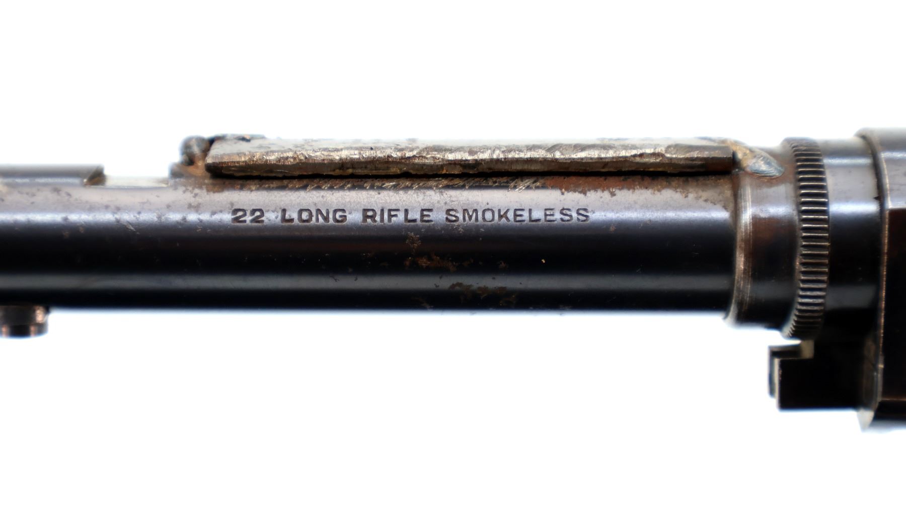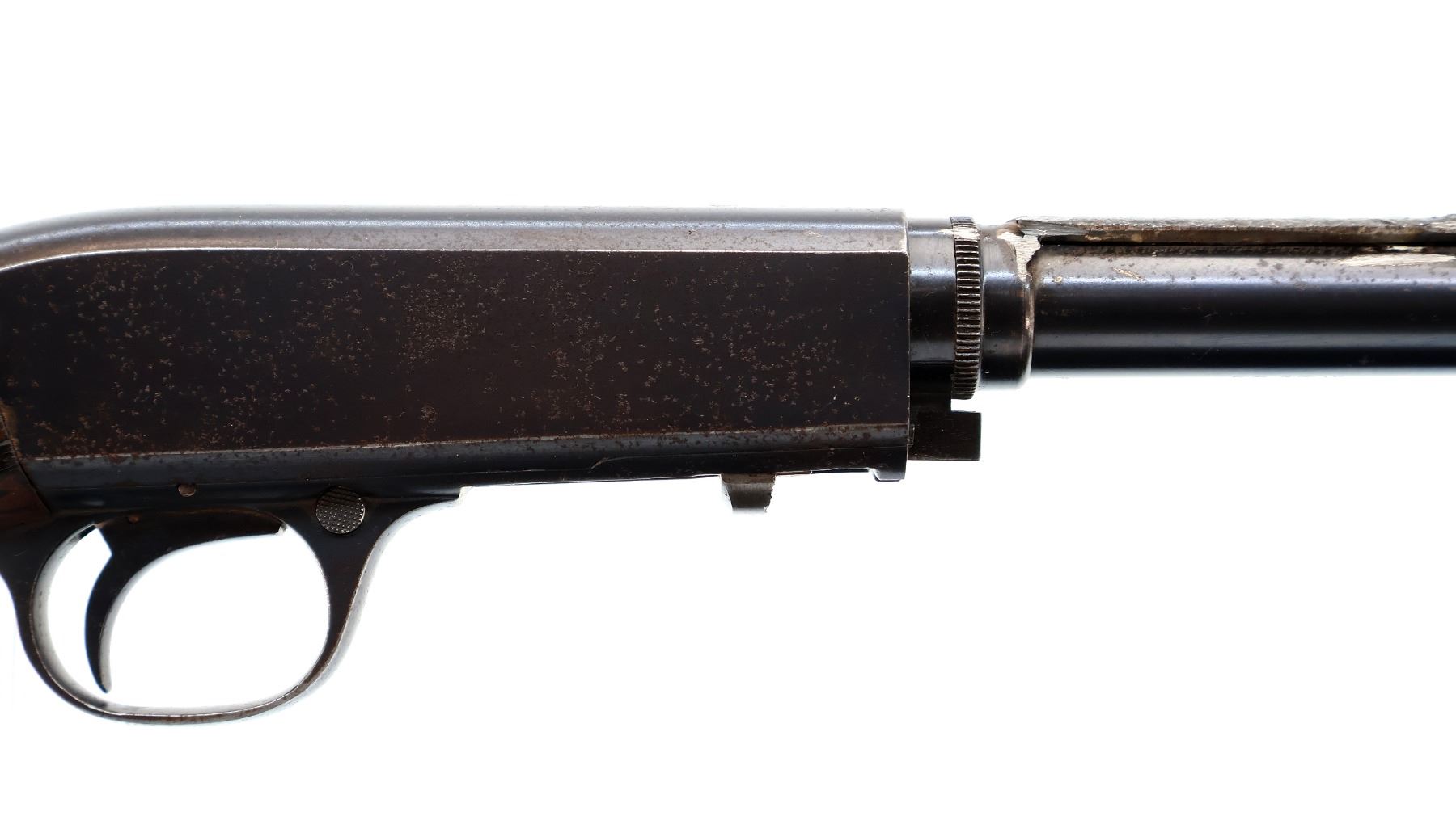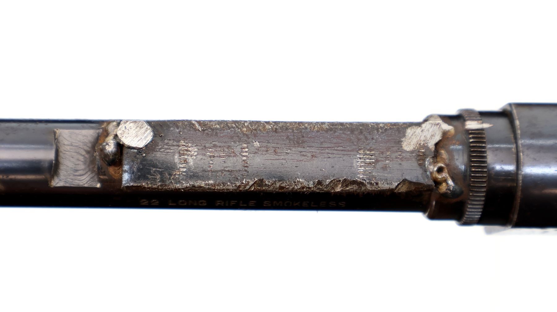 Main Description: Blade front sight, missing rear sight dovetail present, blued finish, custom scope base welded to barrel and adjustment ring, receiver drilled and tapped with no plug screws installed, missing adjustment ring parts, complete forearm and inner magtube assembly. One piece wood stock, pistol grip cracked behind receiver, smooth steel butt plate