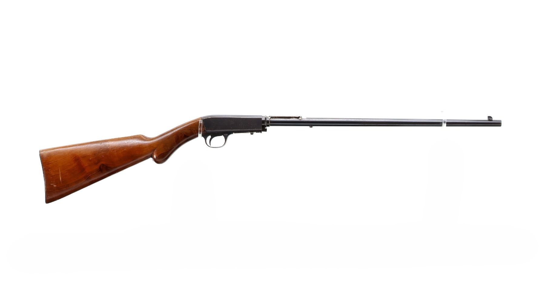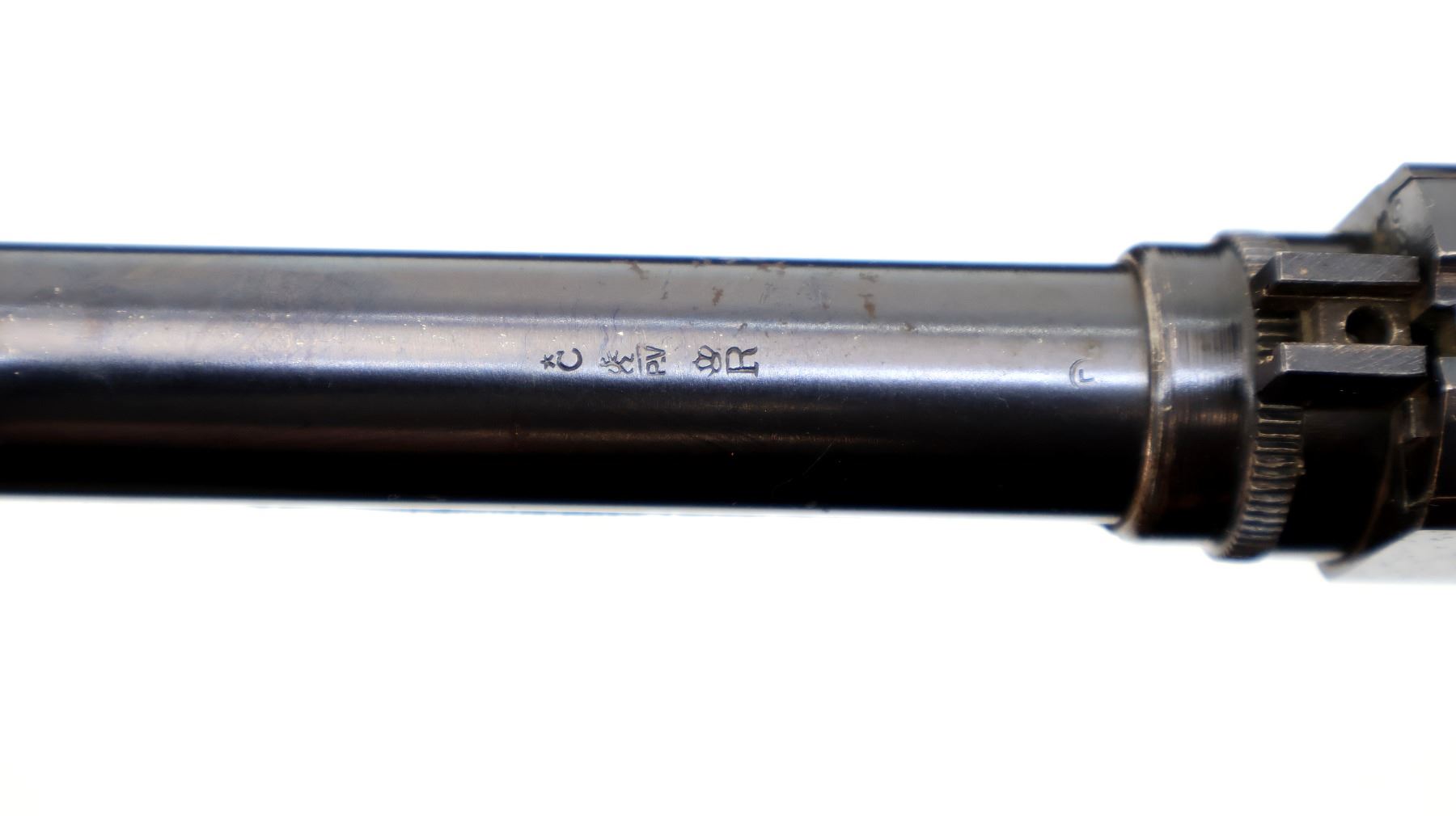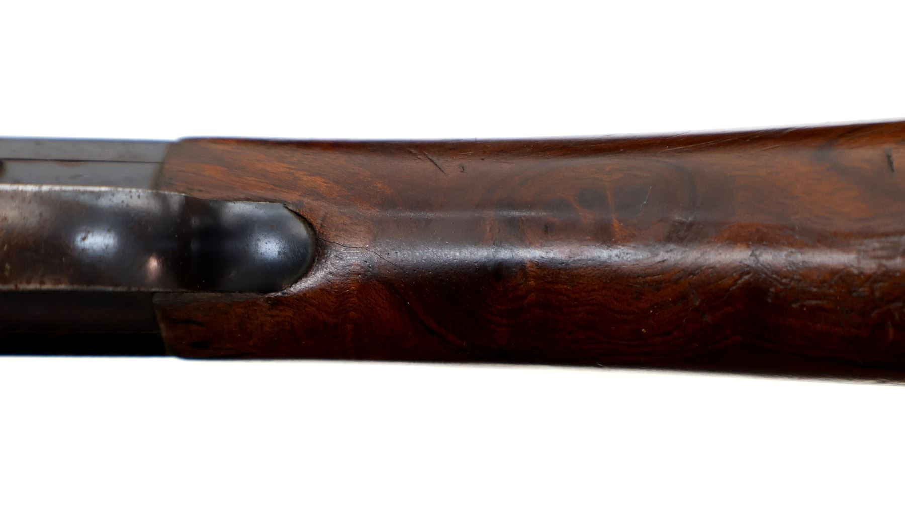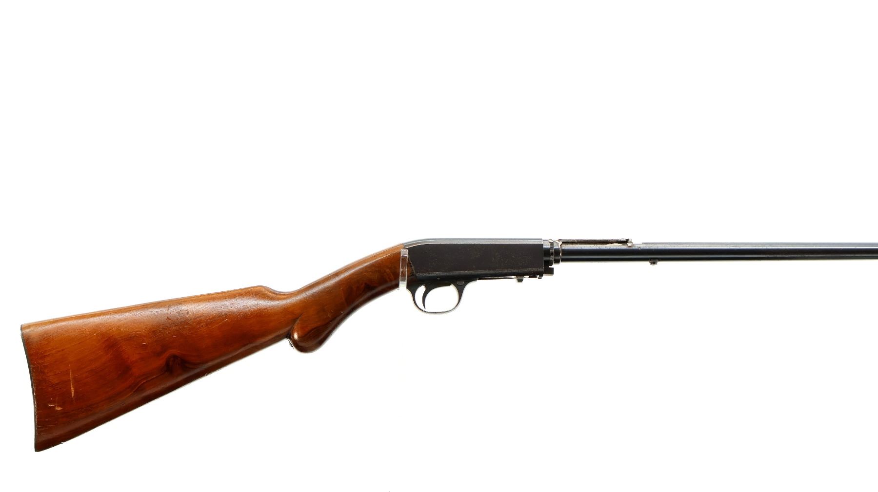 Main Description: Blade front sight, missing rear sight dovetail present, blued finish, custom scope base welded to barrel and adjustment ring, receiver drilled and tapped with no plug screws installed, missing adjustment ring parts, complete forearm and inner magtube assembly. One piece wood stock, pistol grip cracked behind receiver, smooth steel butt plate