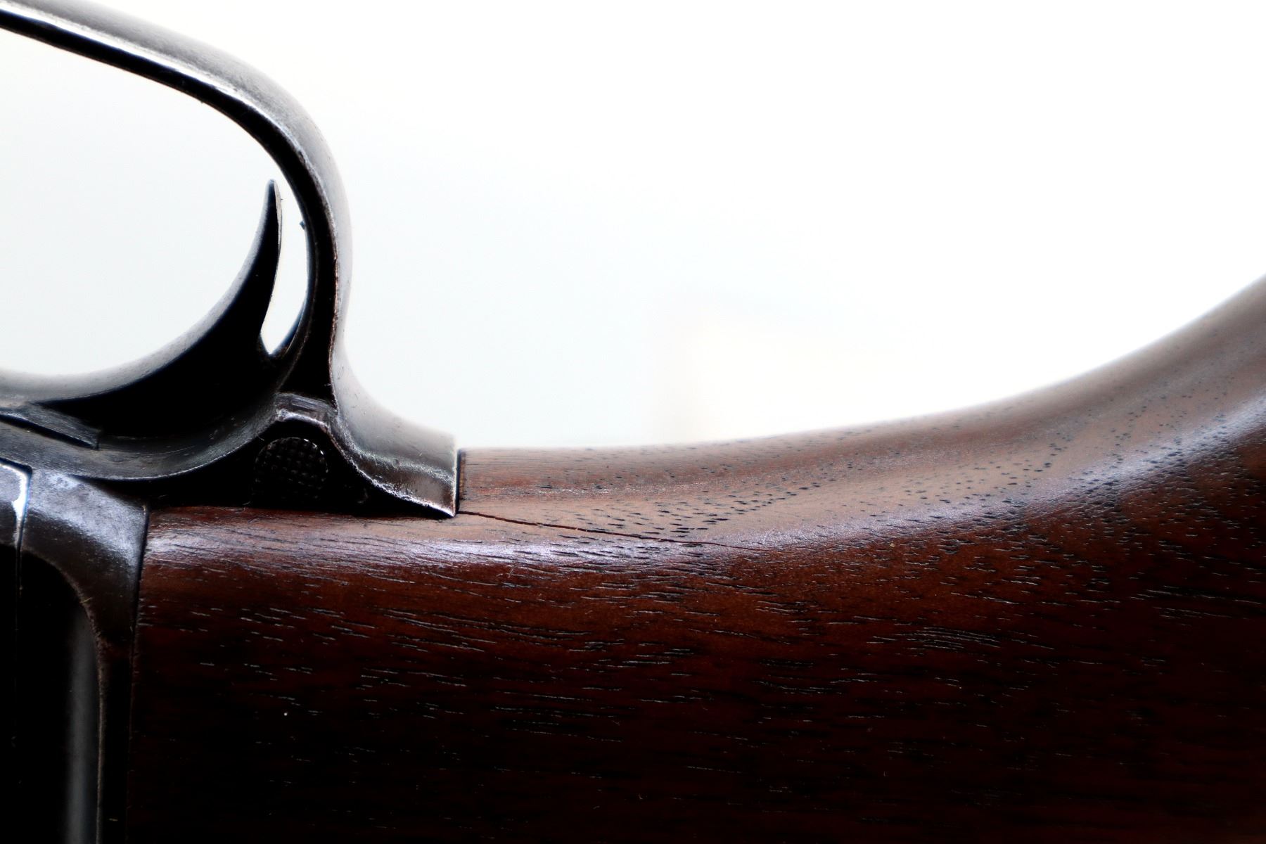Main Description: Blade front sight, adjustable u notched rear sight, round barrel. Two piece wood stocks, custom grooved forearm with replaced screws, pistol grip cracked behind trigger guard, grooved black polymer butt plate