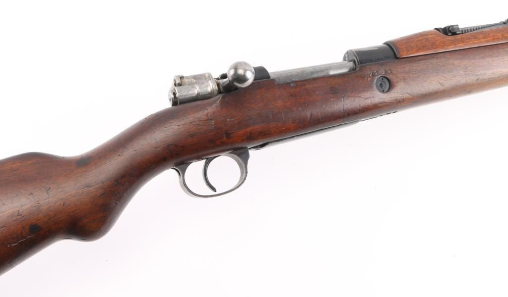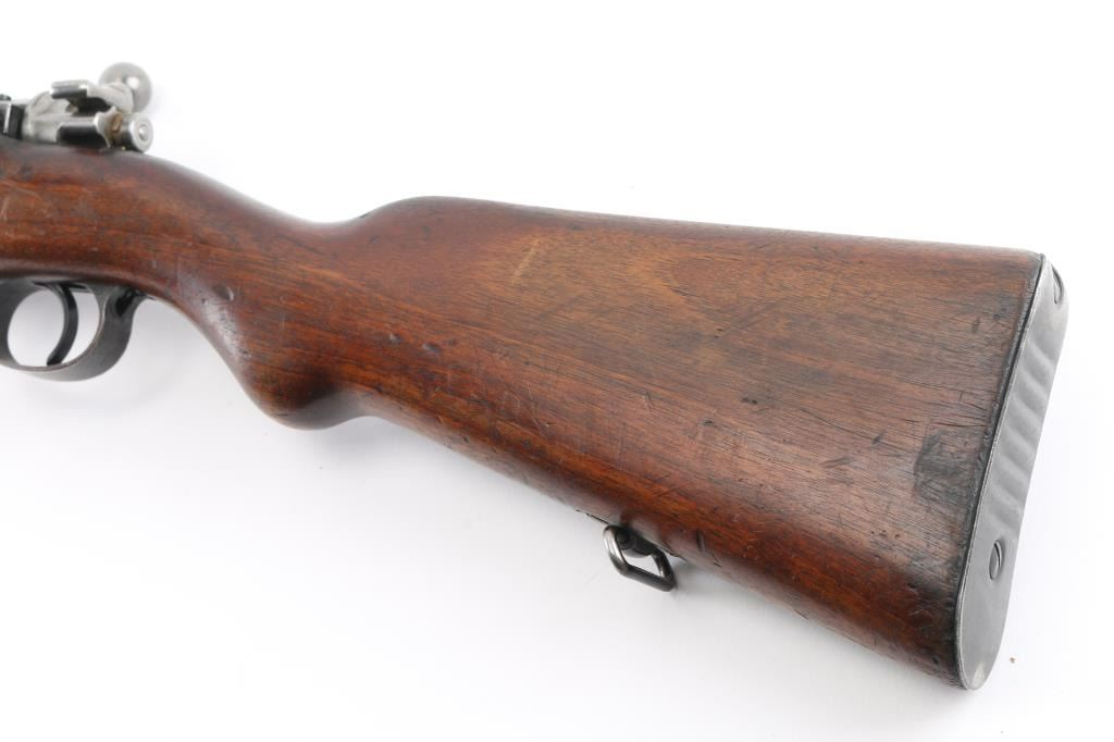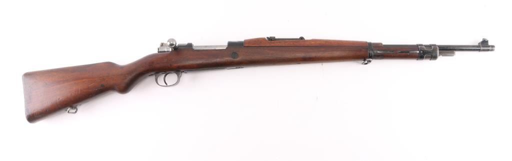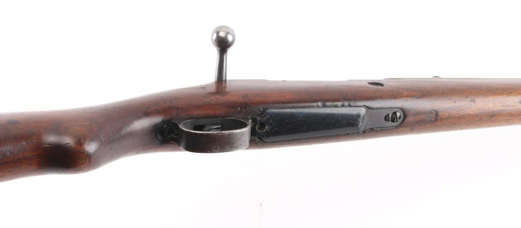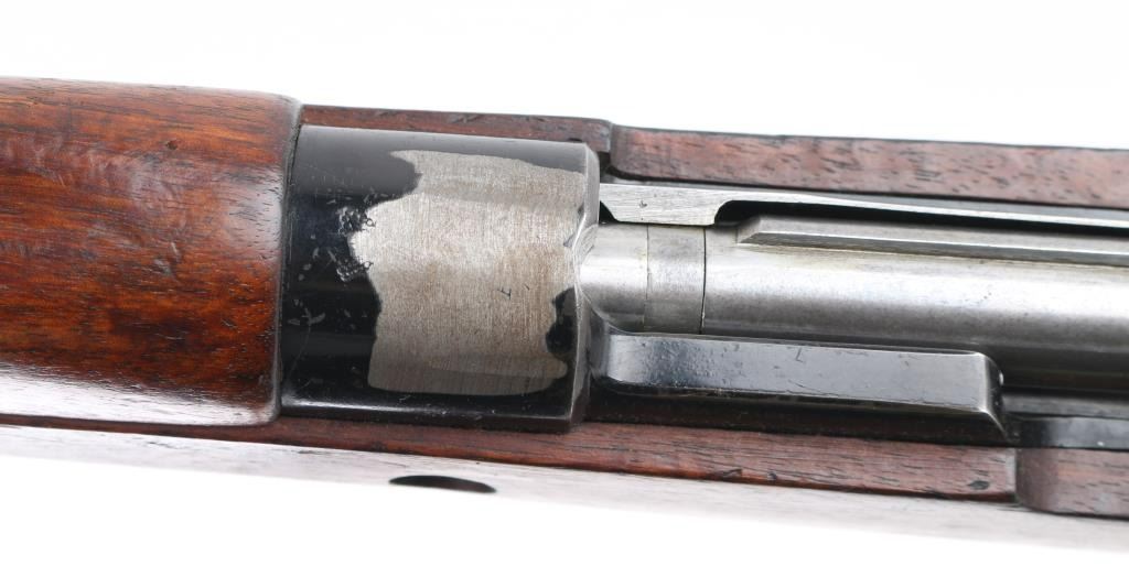 Uncommon military bolt action rifle with most of the crest ground, some remnants of the crown and "ABL" can be seen. Features 24" barrel, blade front & tangent rear sights, bayonet lug, missing the cleaning rod, sling swivels, straight bolt handle, manual safety, wood stock & handguard. Buttplate is stamped metal with wide ribs. Bore is good to very good, mostly bright with some gray tones in grooves. Retains 80% refinish, appears as semi-gloss black paint of previous matte finish, many scratches and scrapes, some losses to edges of markings, bare bright metal where crest was ground off. Polished bolt is very good. Wood is very good, with dents & other signs of field use. Stamped "7295" on stock below receiver ring, and on bolt stem. Visible cartouche under forend. Marked on top of barrel " (*) (*) ". Condition is NRA Good++ *** C&R Firearm ***