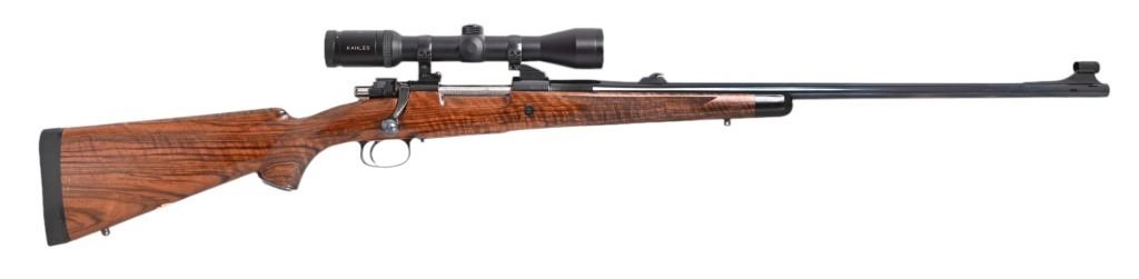 No serial visible. Custom 26" barrel, jeweled bolt, Kahles 1.5-6x42 scope. Bore mikes approximately .33. Very nice wood stock with some handling marks, otherwise an excellent condition rifle. Monogrammed gold medallion on underside of stock. Modern.
