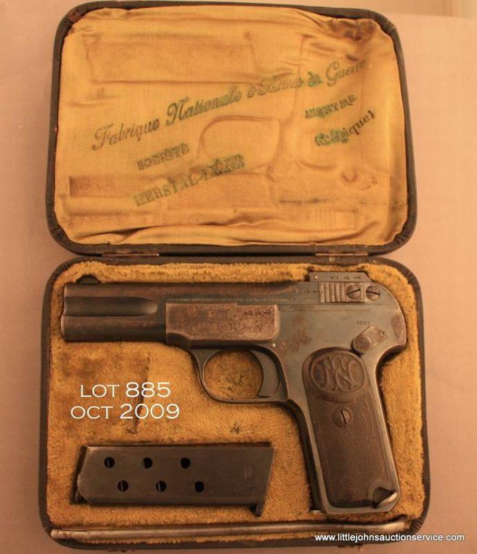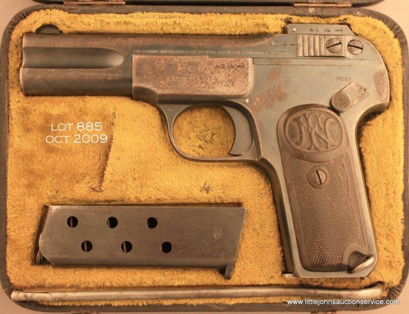 FN Browning Model 1900 semi-auto pistol in fabric covered Factory lined case with cleaning rod and extra magazine, 7.65mm cal., 4” barrel, blue finish, checkered hard rubber grips, #369889. This gun is in overall good condition with somescattered areas of blood pitting on the frame and barrel assembly; the action is good, the bore is good, the grips are good and the markings are clean with an additional period inscription on the top of the barrel in German which reads “To theDistrict Forrester/Hunter Bauer for his services to game hunting/preservation in the section of Saarbruecken for the General German Sport-Hunting Clubs (Allgemeiner Deutscher Jagt Verein)". Est.: $400-$800.