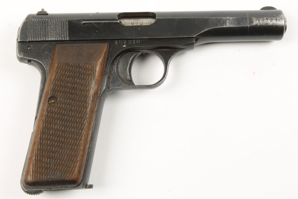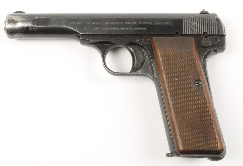 Nazi proofed Belgian made Browning design semi-automatic pistol. All matching numbers. Bore is shiny with good rifling. All safeties work. Bluing is worn on the muzzle cap from holster wear. Wood grips show light wear on the right grip. Condition is good to very good. *MUST BE REGISTERED*