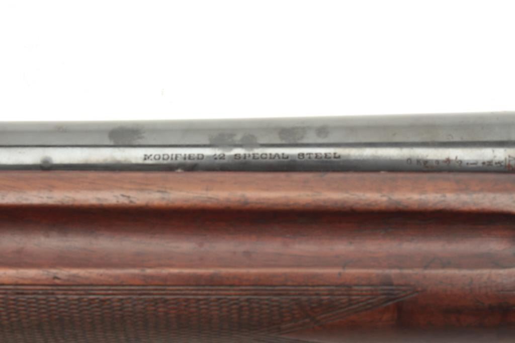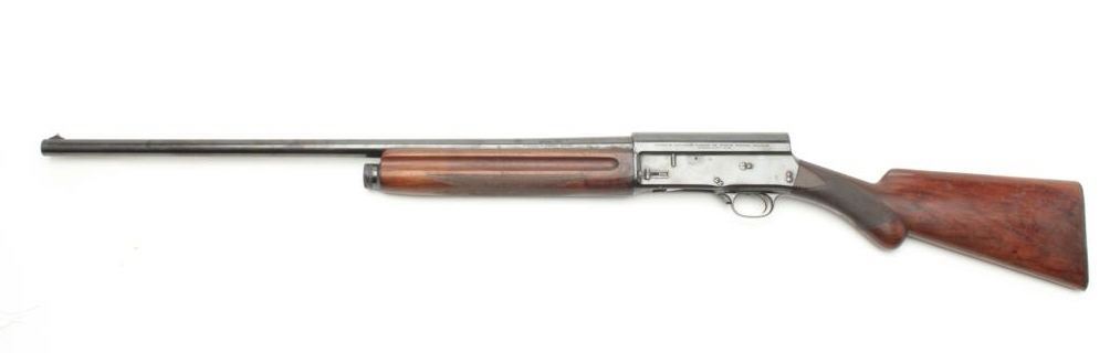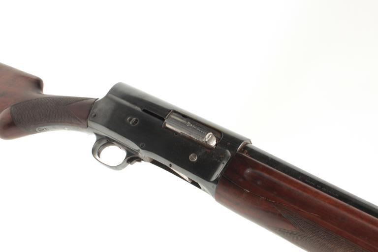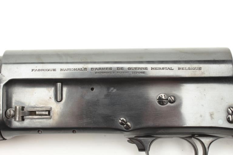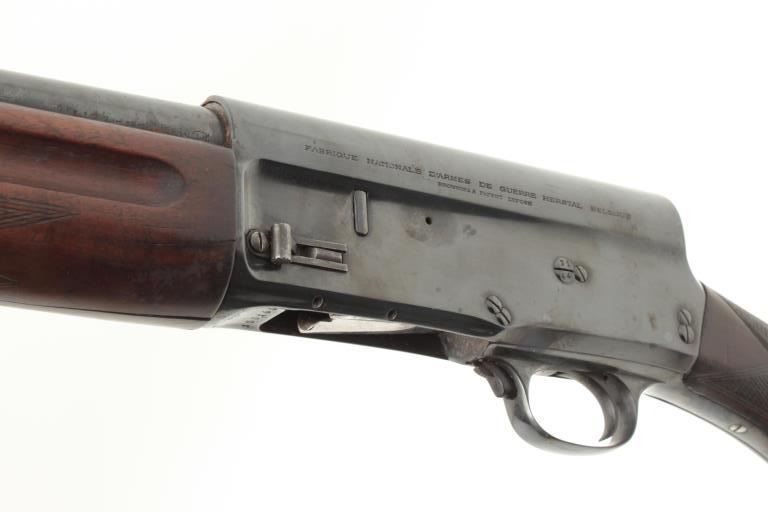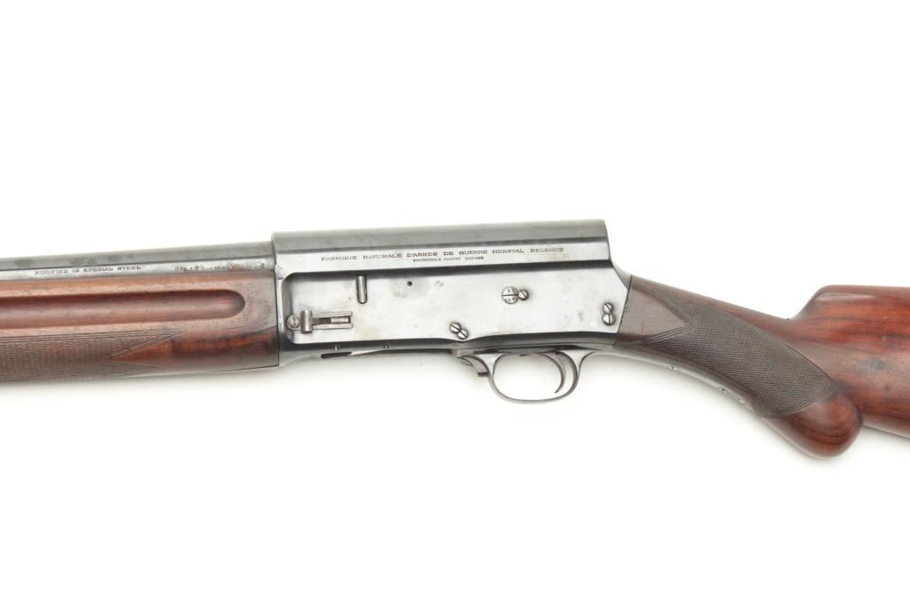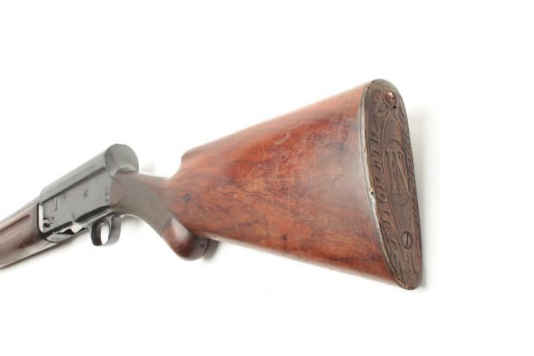 FN Browning Patent semi-automatic shotgun, 12 gauge, 27.5” barrel, checkered wood stocks, appears to have an old re-blued finish, S/N 153144; good action, good markings, bore may clean, some scattered surface rust fromstorage, forend shows a crack on right rear side, old scratches and mars to butt stock with some minor damage to FN Browning butt plate, again from storage. (C&R). Est.: $100-$200.