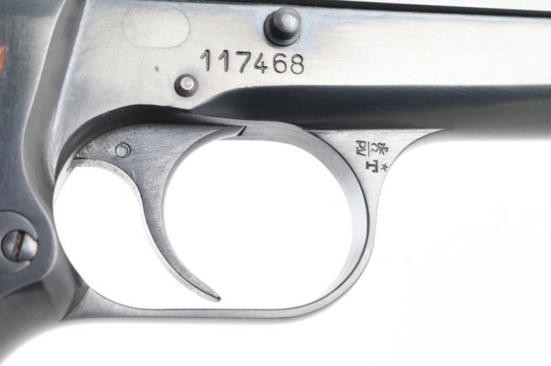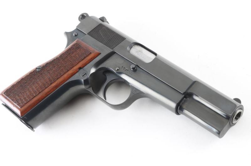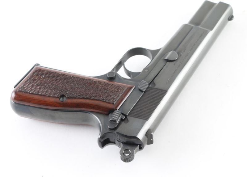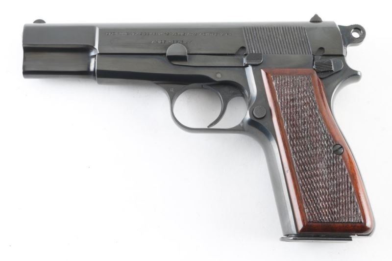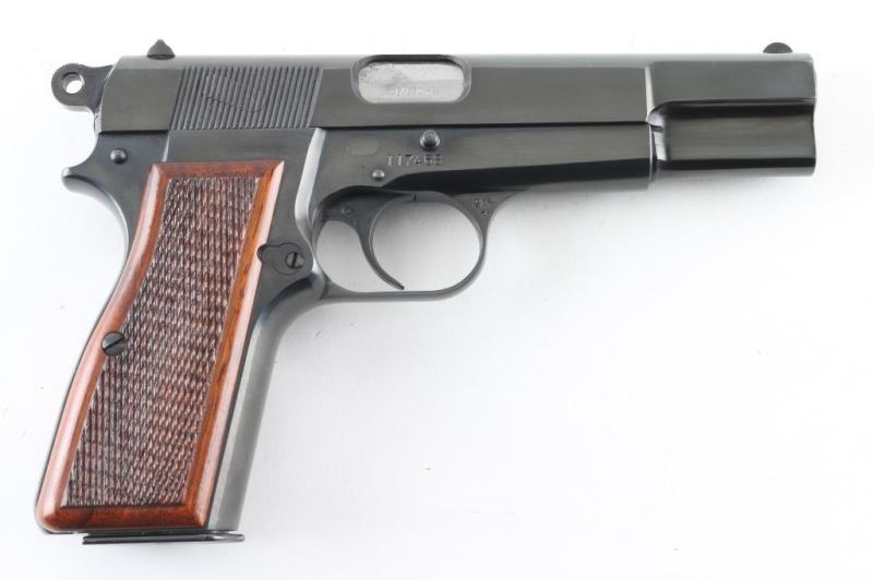 Pistol. Semi-Automatic. 13 rd magazine, Short recoil operated tilting barrel. 4.7" barrel. Rowel ring hammer. Left slide stamped "Browning Arms Company St Louis Mo. & Montreal P.G." "Made in Belgium". These markings started in 1954. Serial number on right side of frame. No other parts with serial numbers. Left triggerguard stamped "R". Belgium proofs on barrel, and right triggerguard. All markings are crisp and clear. Bore is very good with strong rifling, but a little dirty. High polish blue finish is about 97% with minor scratches/edge wear. Possibly reblued, the current finish looks original, although with some rounding or curving at edges of flats that often are symptoms of refinish. There is tracking line on the left slide. Checkered brown varnished wood grips are very good."Made in Italy" stamped on the magazine. A really nice conditioned early pistol.