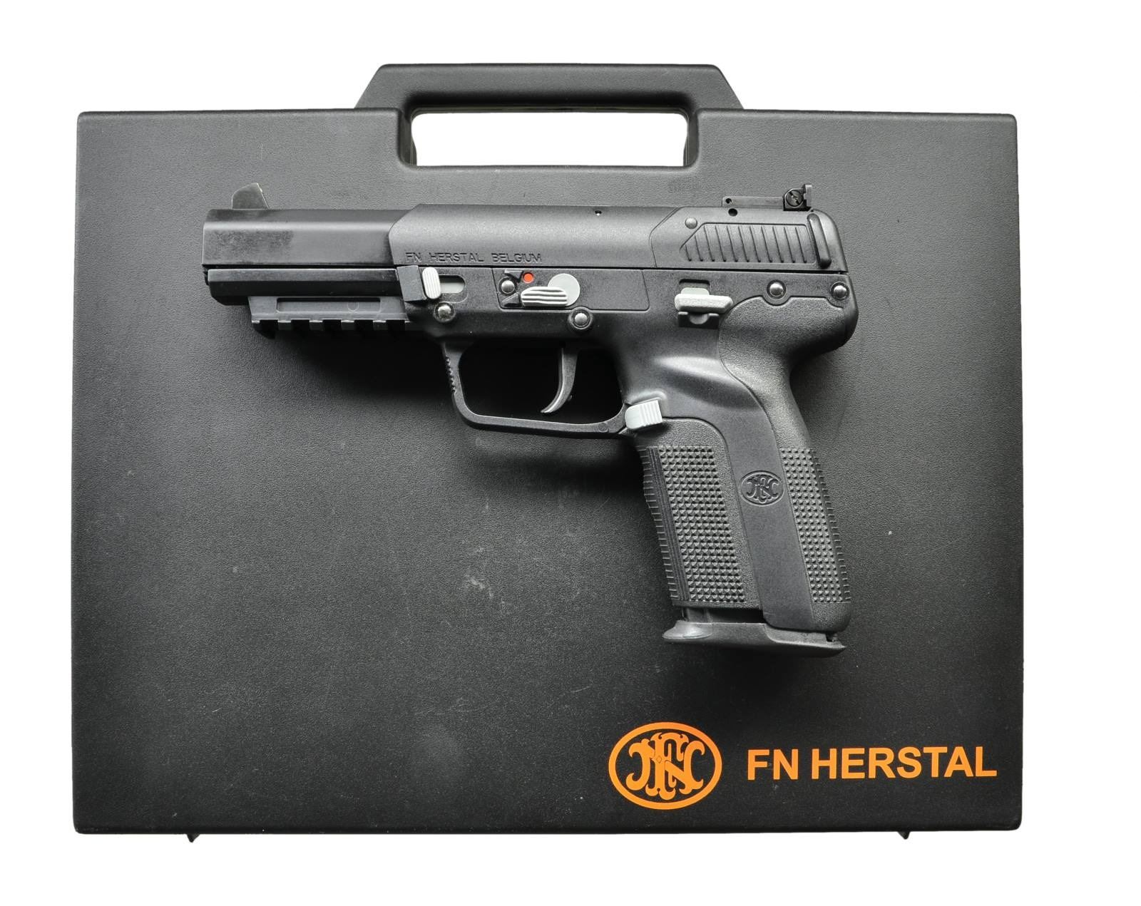 & ACCESSORIES. Cal. 5.7x28. S# 386116927. Bbl. 5". 3 Dot adjustable sight. Ambidextrous safety. Integral accessory rail. Textured grips. MAGS: 3 - 20 rd. UNATTACHED ACCESSORIES: original box & paperwork. CONDITION: all aspects near excellent. (22-4402/ZAL). MODERN. $700-1,100.