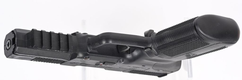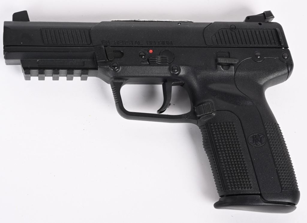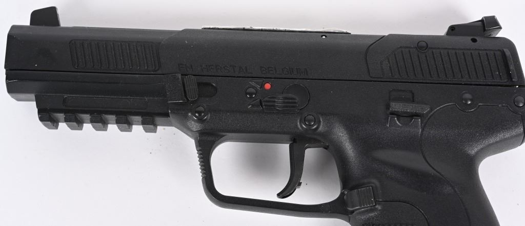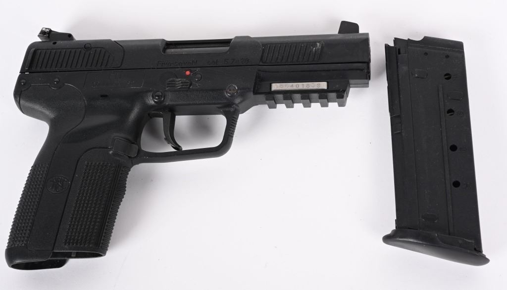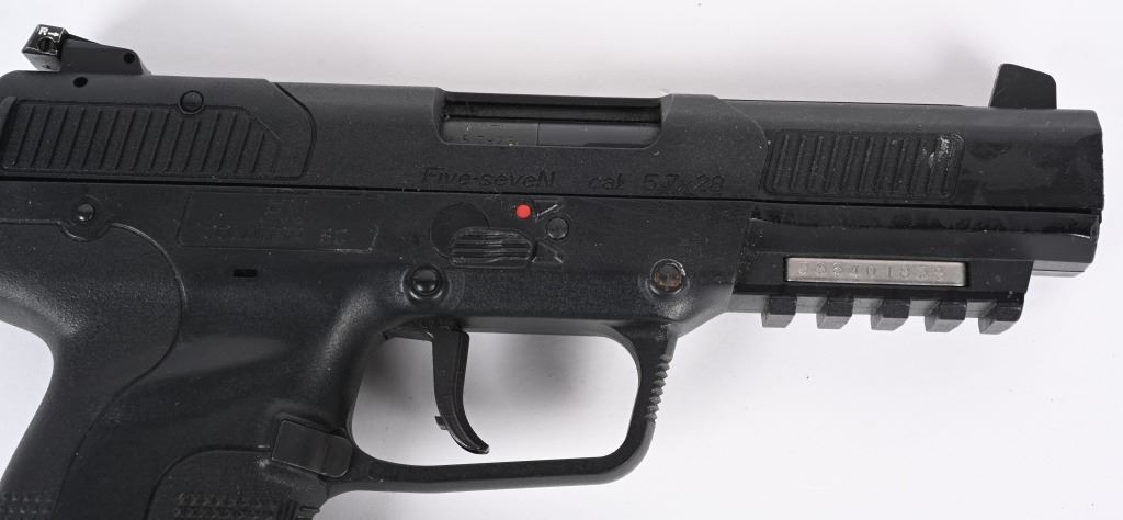 SERIAL NUMBER: 386401838. BARREL: 5". CALIBER: 5.7X28. MANUFACTURED: 2000'S. Fairly early Belgian made gun. Blade front sight and u-notch rear. Black Polymer frame, with accessory rail on the bottom. Includes factory 20 round polymer magazine. CONDITION: Very good overall, with light wear and minor scratches. Bore is shiny with crisp rifling. Fine mechanics. Magazine is excellent. MODERN