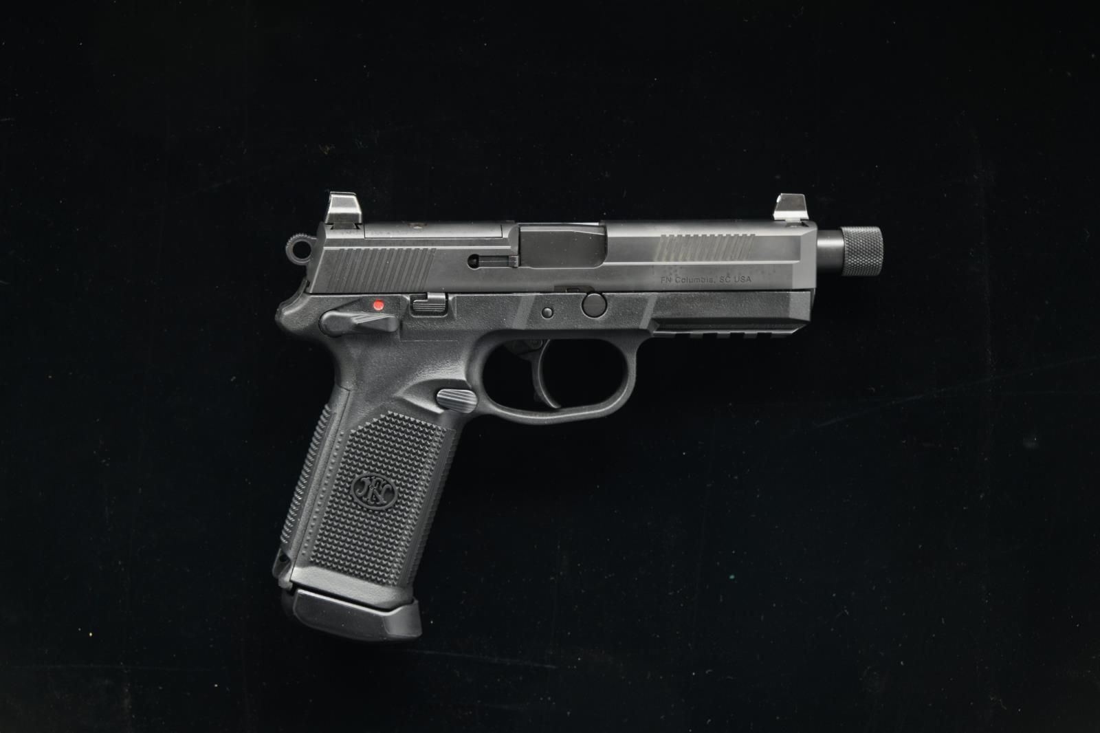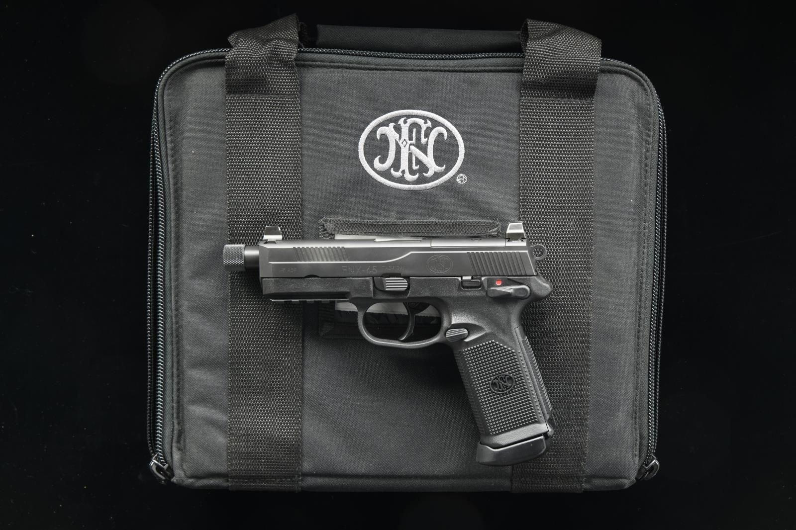 Cal. 45 ACP. S# FX3U122368. Bbl. 5 1/3", threaded w/ thread protector. Tall profile, three dot sights. Slide has RMR cut for reflex sight mounting. Matte black finish. Polymer frame w/ accessory rail. MAGS: 3-15 rd. UNATTACHED ACCESSORIES: matching numbered factory hardcase w/ manual, cable lock, RMR parts kit, & three spare grip straps. CONDITION: all aspects near excellent. PROVENANCE: the Collection of Gun Sport Ltd owned by Jon R. Thomas. (23-3001/MJC). MODERN. $1,000-1,500.