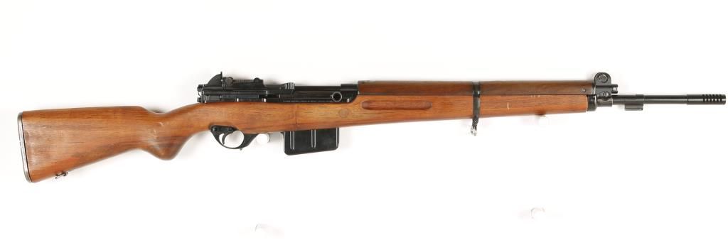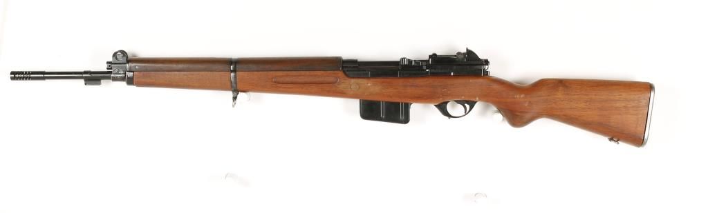 Belgium made semi -auto military rifle made under contract for Venezuela. Blued finish, plain pistol grip walnut stock, 23" barrel, fixed 10 round magazine, shrouded front sight, graduated rear aperture sight, sling swivels and bayonet lug. Very good bore and action. Condition: Very good showing light dings and scratches in wood. *Curio & Relic Firearm*