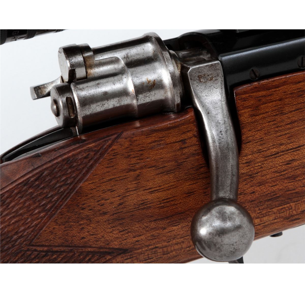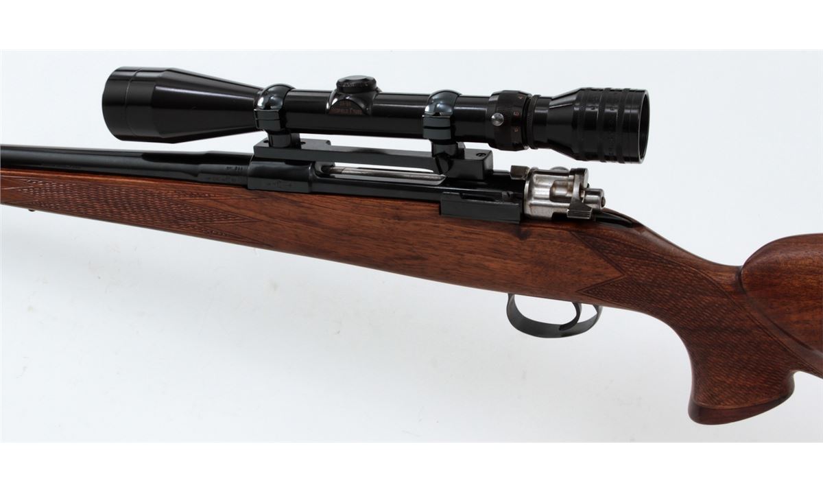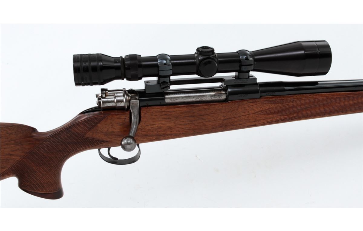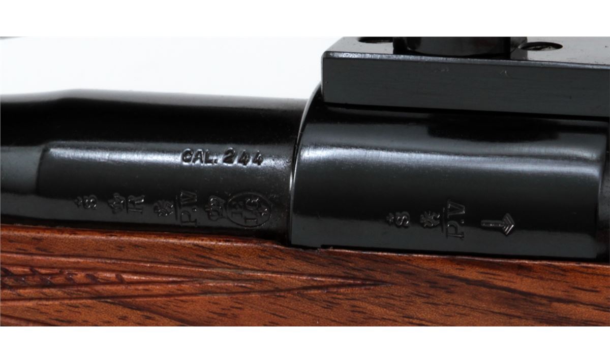 FN Mauser Sporter Bolt Action Rifle, #36357, .244 cal., 24'' barrel, blue finish, jeweled bolt and extractor, with custom walnut cheekpiece stock with rosewood forend and pistol-grip cap. Topped with a Redfield 3-9x scope on Redfield rings and mounts. Condition is excellent as shooter modified, retaining approx. 98% of a rich blue/black color. Front sight has been removed to accommodate scope view. Stock is good with light scuffs and scratches. Action is crisp, bore is bright, scope optics are clear with duplex type reticle. Est.: $450-$600. (C&R)
