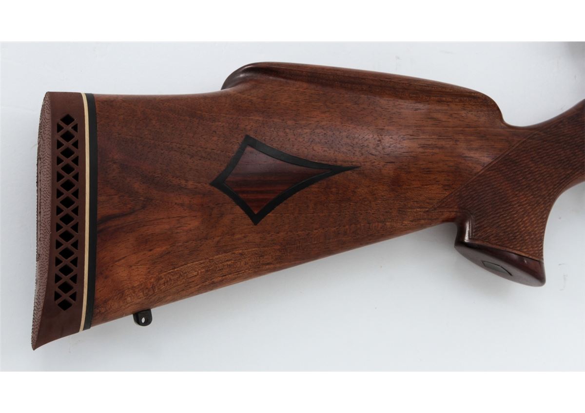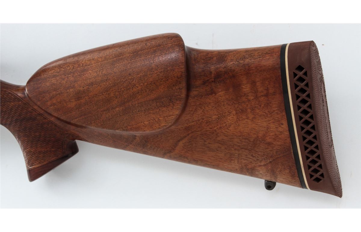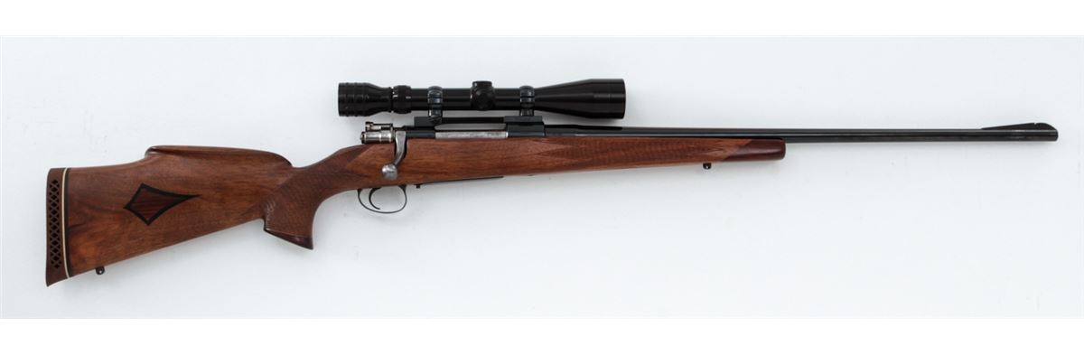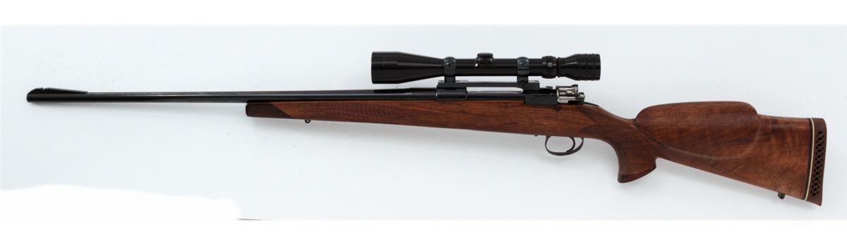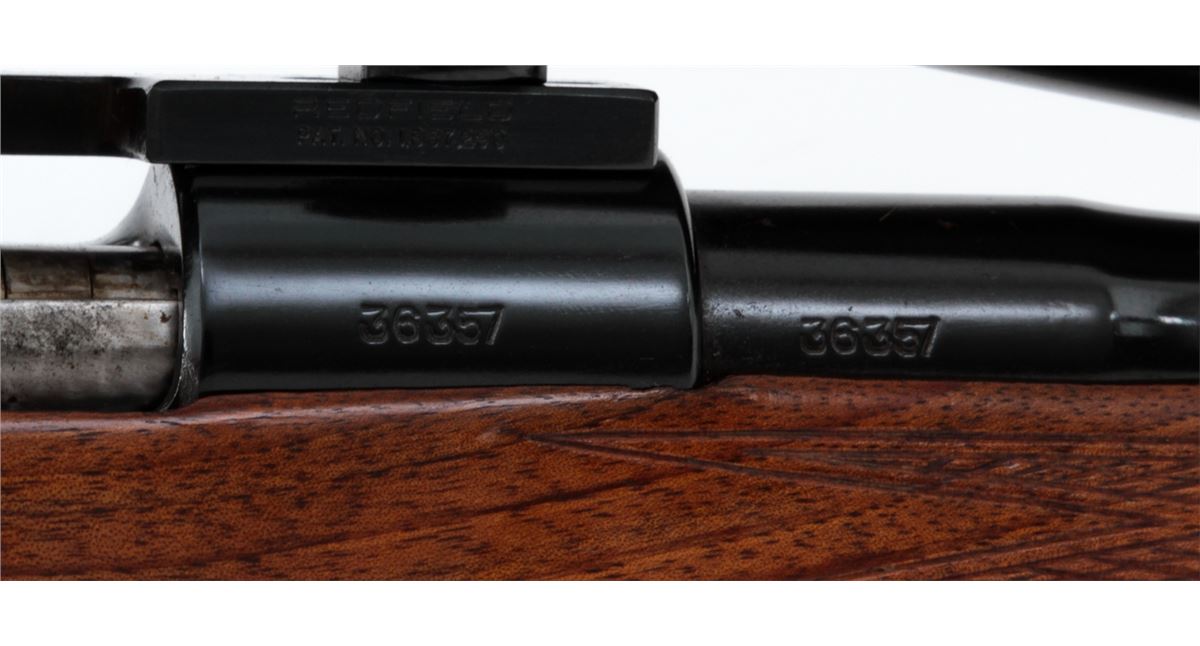 FN Mauser Sporter Bolt Action Rifle, #36357, .244 cal., 24'' barrel, blue finish, jeweled bolt and extractor, with custom walnut cheekpiece stock with rosewood forend and pistol-grip cap. Topped with a Redfield 3-9x scope on Redfield rings and mounts. Condition is excellent as shooter modified, retaining approx. 98% of a rich blue/black color. Front sight has been removed to accommodate scope view. Stock is good with light scuffs and scratches. Action is crisp, bore is bright, scope optics are clear with duplex type reticle. Est.: $450-$600. (C&R)