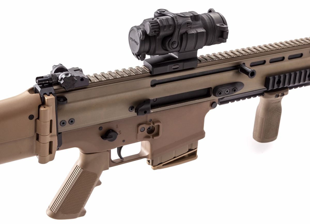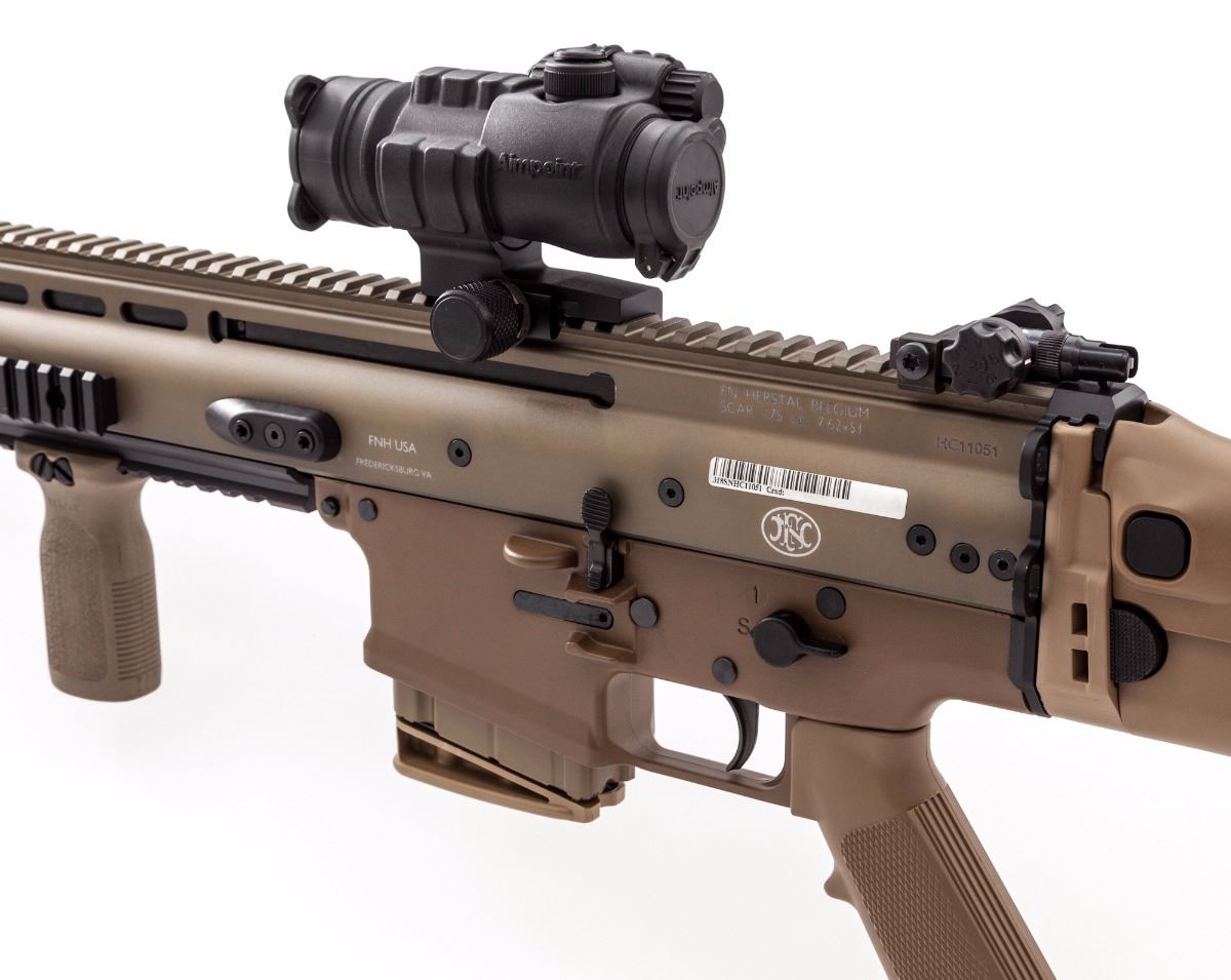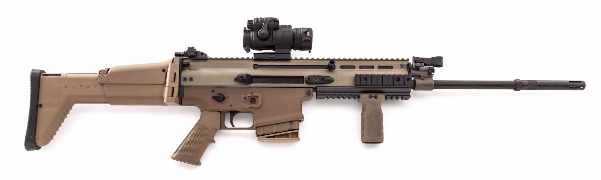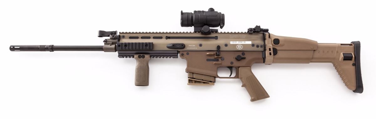 FN SCAR 17S Semi-Automatic Rifle, #HC11051, .308 cal., 21'' barrel including muzzlebrake, flat dark earth finish, hard anodized aluminum receiver, folding telescopic polymer stock, quad rails which includes a full-length upper rail, ambidextrous safety lever, factory folding iron sights, added front hand grip, and bullet button. Topped with an Aimpoint Red Dot scope. In original box with seven (7) 10-round magazines, one blue finished and the others dark earth finished, and reproduced copy of owner's manual. Condition is excellent. Matte surfaces with light scuffs, the most noticeable being to the exposed portion of the barrel, as well as some minor wear to the finish near the ejection port. Aimpoint Red Dot scope is clear and functions as designed. Action is tight, bore is bright. Est.: $3,200-$4,200. (Modern)