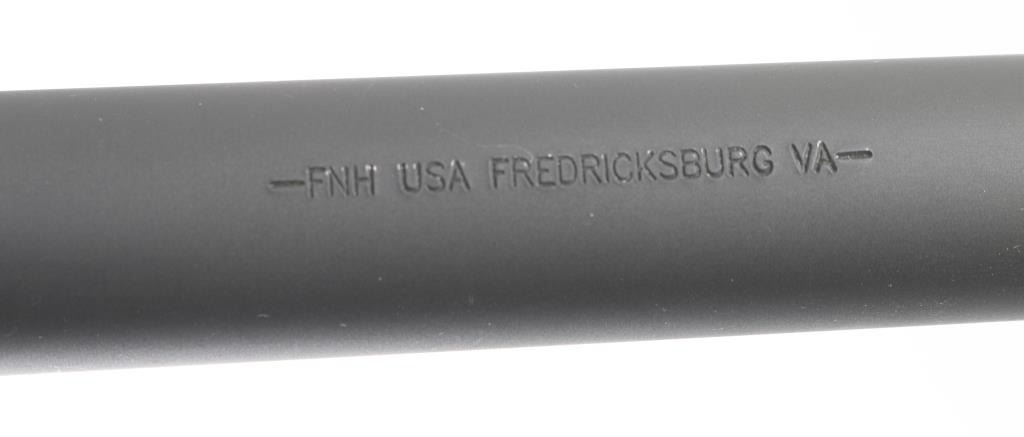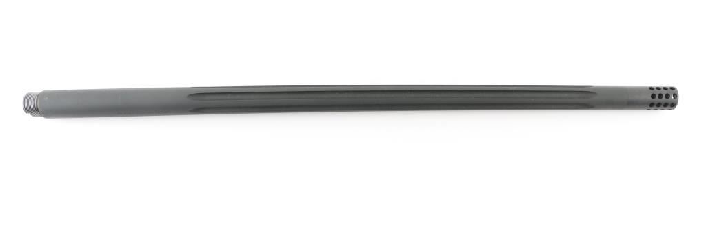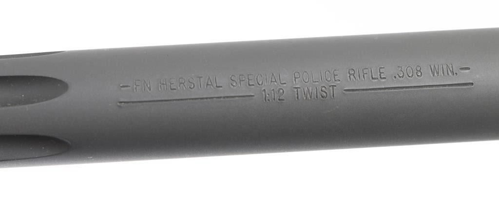 an excellent condition take-off barrel from FNH, marked for the Winchester Model 70 based Special Police Rifle in 308 Winchester. 24" fluted medium-heavy barrel, parkerized, with pepper pot muzzle brake installed. Cone breech and extractor cut. Bright clean bore, condition is excellent overall with minor scuffs and handling marks.