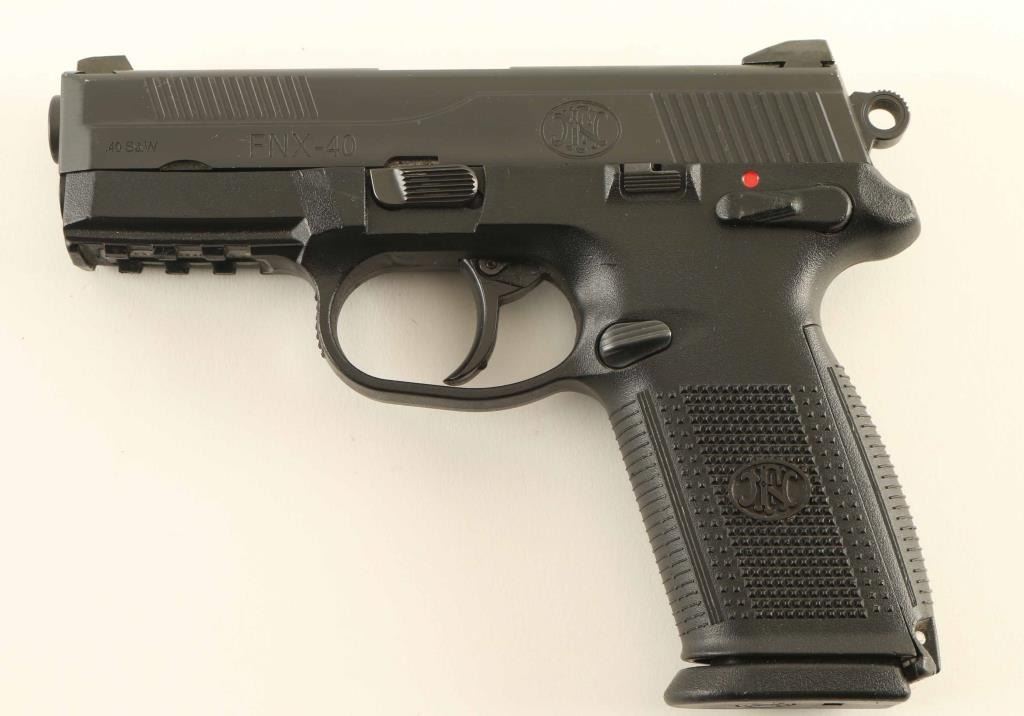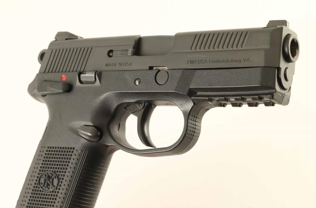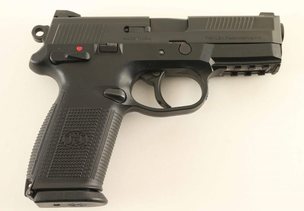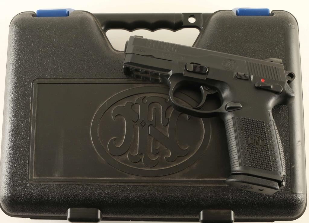 Semiautomatic pistol chambered for 40 S&W. Features dovetail mounted 3 dot sights, 4" barrel, operates double and single action, frame mounted safety/decocker, black polymer frame with accessory rail, black steel slide, ambidextrous controls, lanyard attachment point at butt. Bore is in excellent condition. Overall condition is 98% with minor handling marks and accumulated dust and dirt. Includes one magazine, manual, FN hard plastic carry case. Condition is NRA Excellent ***Modern Firearm***