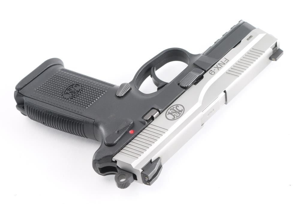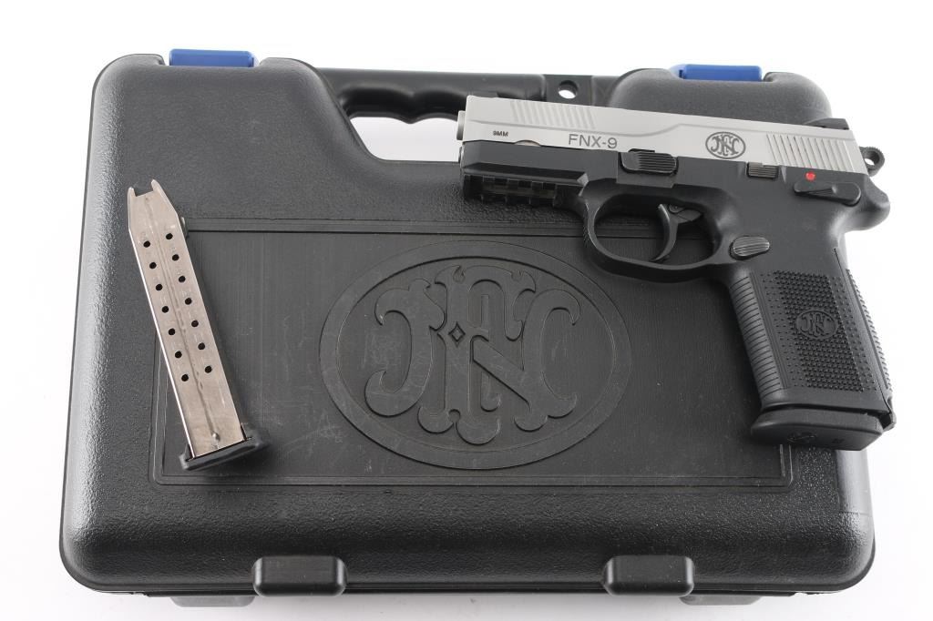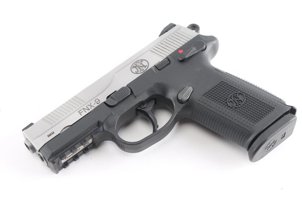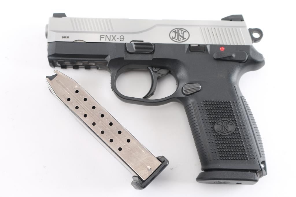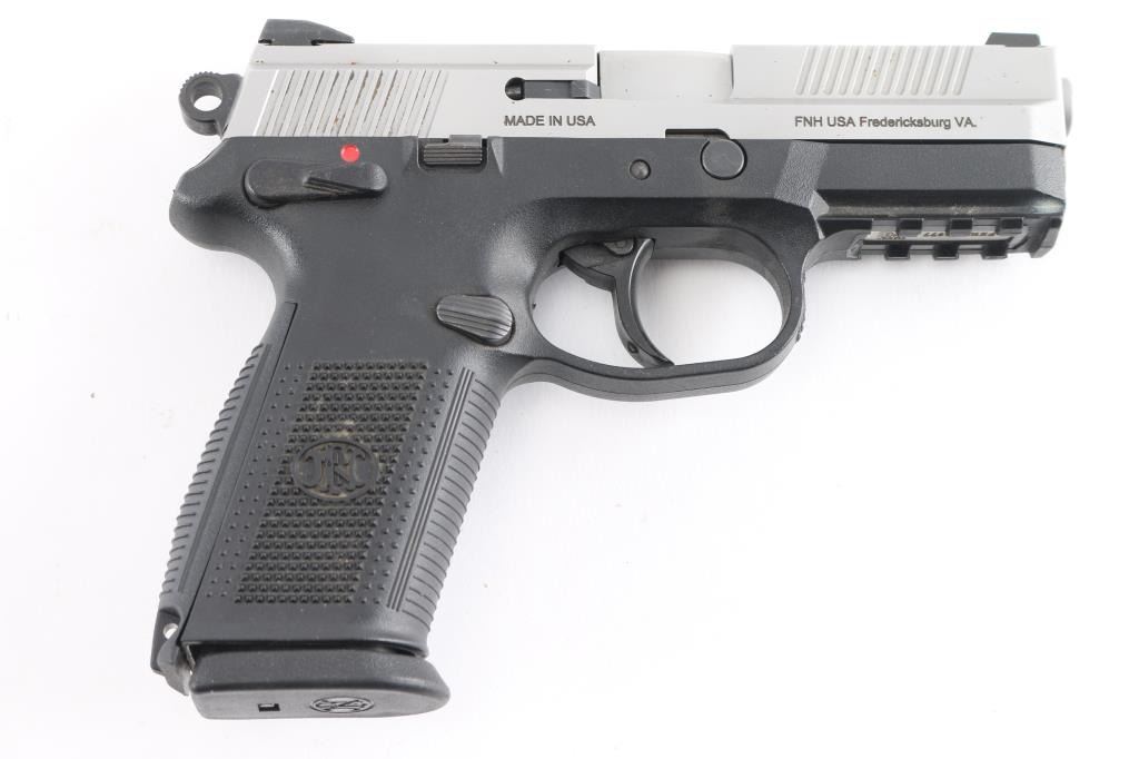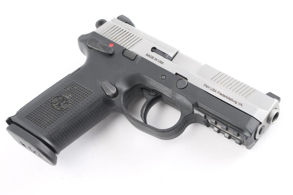 Double action semi auto pistol, features 4" cold hammer-forged stainless steel barrel and slide, polymer frame with Picatinny rail and interchangeable grip back straps with lanyard loop, 3 dot sights, ambidextrous decocking/safety lever, slide stop, and magazine release, serrated trigger guard and round serrated hammer. Bore is bright and strong rifling. Retains 98% finish with small rust spots on right side of slide. Includes black plastic factory case, two 17rd magazines, three backstraps and manual.NRA condition is good to very good. ***Modern Firearm***