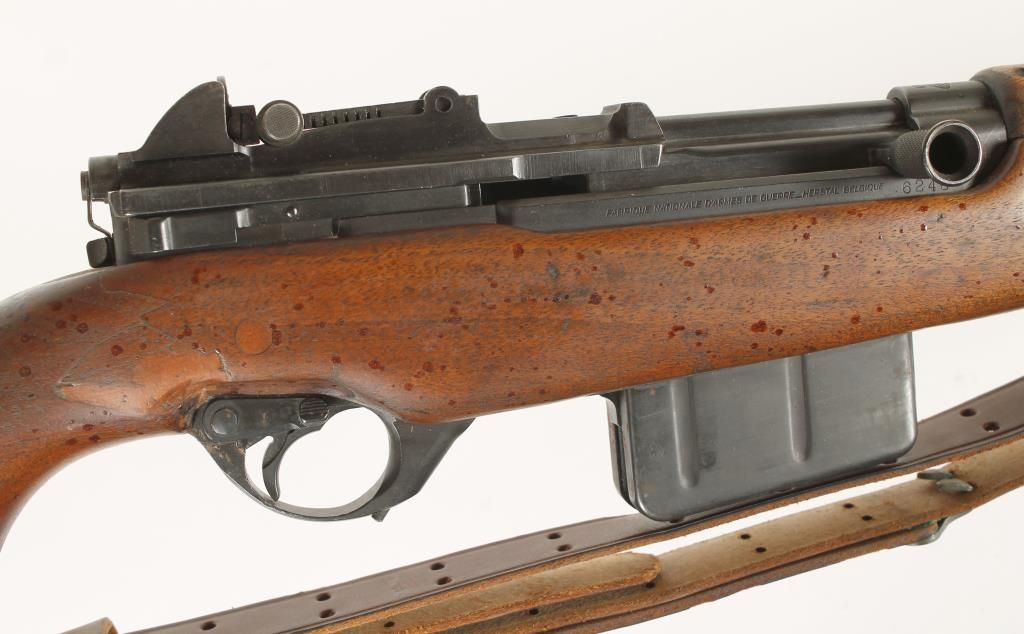 Belgium made semi-auto military rifle made under contract for Egypt. Blued finish, plain pistol grip wood stock, 23" barrel, fixed 10 round magazine, shrouded front sight, graduated rear aperture sight, sling swivels, bayonet lug and brass butt plate. Dark bore and good action. Condition: Good showing light dings and scratches in wood and spray lacquer has been applied. *Curio & Relic Firearm*