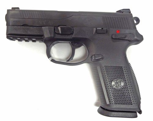FNH USA FNX-40 Semi Auto Pistol. 40 SW. Action: double action. Stock: black checkered polymer. Capacity: 14+1. # of magazines: 3. Safety: ambidextrous decocking lever/manual safety. Sights: Front: 1 white dot. Rear: 2 white dots. Barrel lengtH: 4" hammer forged stainless. Weight: 24.4 oz. Features: ambidextrous slide stop levers and magazine release, 4 interchangeable back straps.