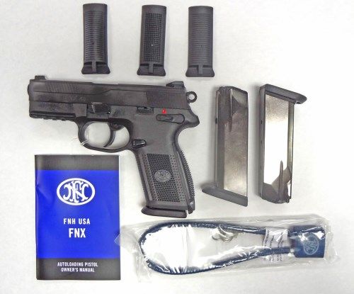 FNH USA FNX-40 Semi Auto Pistol. 40 SW. Action: double action. Stock: black checkered polymer. Capacity: 14+1. # of magazines: 3. Safety: ambidextrous decocking lever/manual safety. Sights: Front: 1 white dot. Rear: 2 white dots. Barrel lengtH: 4" hammer forged stainless. Weight: 24.4 oz. Features: ambidextrous slide stop levers and magazine release, 4 interchangeable back straps.