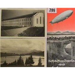 FOLDED BROCHURE IN RESPECT LZ 129 "HINDENBURG AND LZ 127 "GRAF ZEPPELIN" WITH ILLUSTRATION OF "HINDENBURG" ON FRONT. IN GERMAN TEXT TOGETHER WITH POSTCARD SHOWING THE HANGAR. GOOD CONDITION.