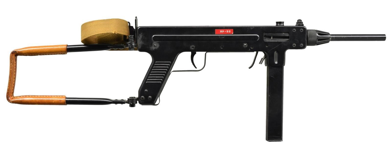 Cal. 9mm. S# 44312. Bbl. 8". There are very few SMGs as unusual as the Danish Madsen M50. It is an open bolt blowback operated, full auto only, variant that incorporates a safety mechanism which must be engaged w/ the support hand in order to fire. A lever that protrudes to the rear of the mag. well has to be depressed during firing or the bolt cannot drop completely into battery & will not fire. The cyclic rate is on the slow side at approximately 500 rds. per minute. Black painted finish w/ folding shoulder stock that is wrapped in leather as an improvised cheek rest. The bbl. is supported via nut that is threaded from the front in a similar manner to the Uzi SMG, once the nut is removed the receiver of the M50 opens like a clam shell to reveal the internals. The safety is a sliding switch located above the trigger on the left side of the receiver. Sights are crude yet extremely effective, especially give the slow cyclic rate that also aids in controllability. Front sight unprotected blade, rear sight is simple peep welded to the rear of the receiver. Tan canvas sling attached to left side. MAGS: 1-32 rd. CONDITION: finish coverage is complete w/ some minor scratches as typically found in armory kept firearms. Folding stock closes firmly & holds tight against receiver in that position, as well as locking firmly into place while extended. Bore is shiny w/ very strong rifling. Fire control mechanism appears to function correctly when cycled by hand. NATIONAL FIREARMS ACT MG REQUIRING BATF TRANSFER BEFORE TAKING POSSESSION. FULLY TRANSFERABLE. (03-1456/JZ). CURIO CLASS III. $8,000-12,000.