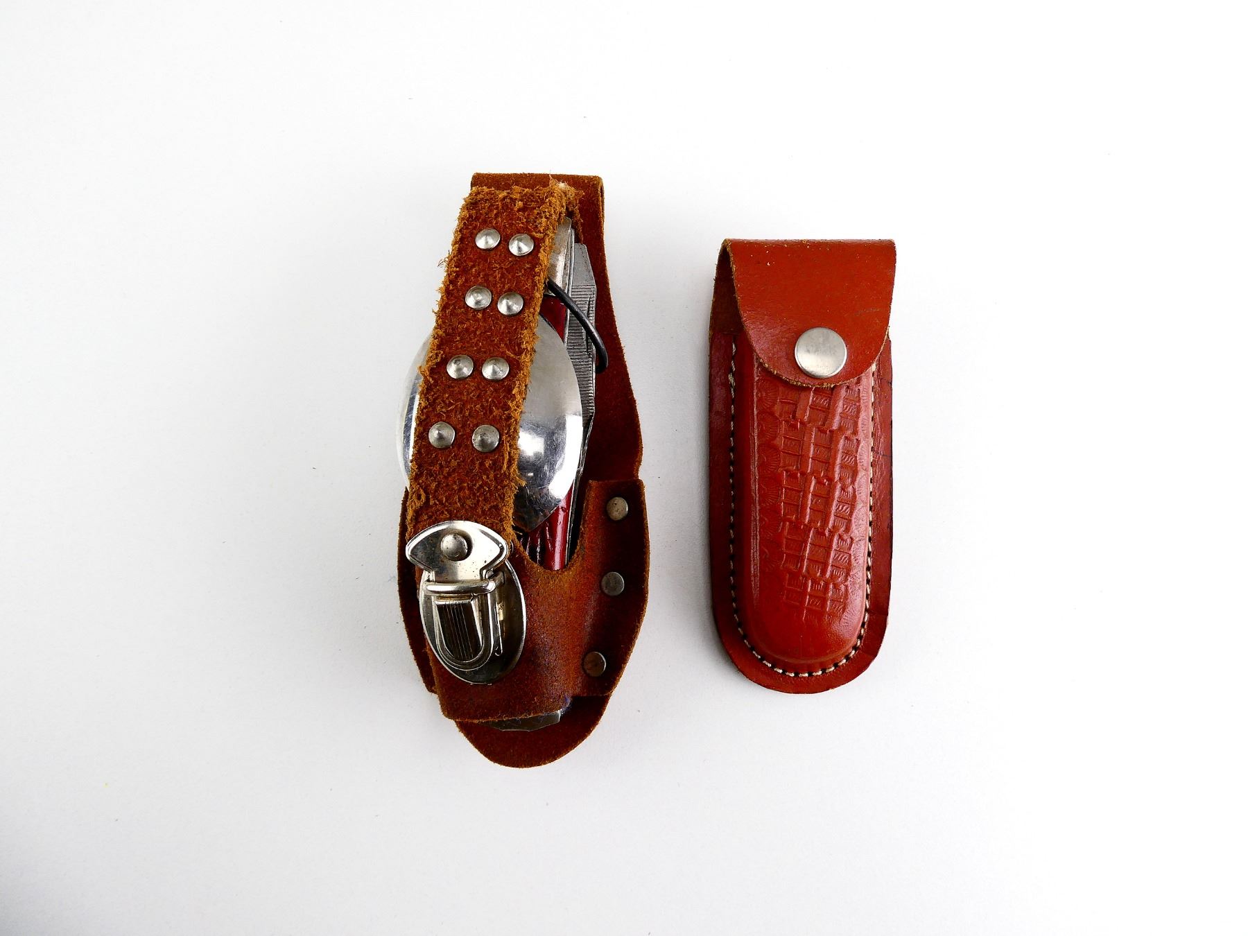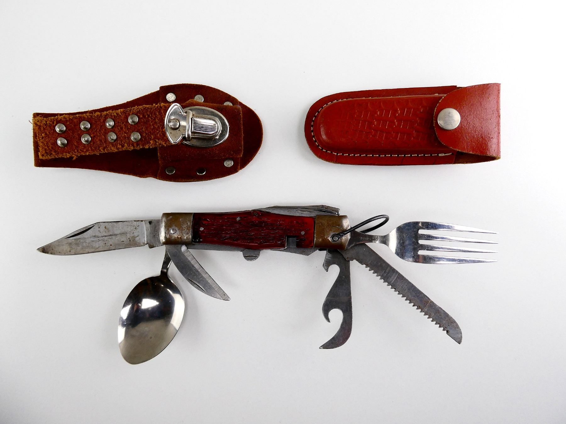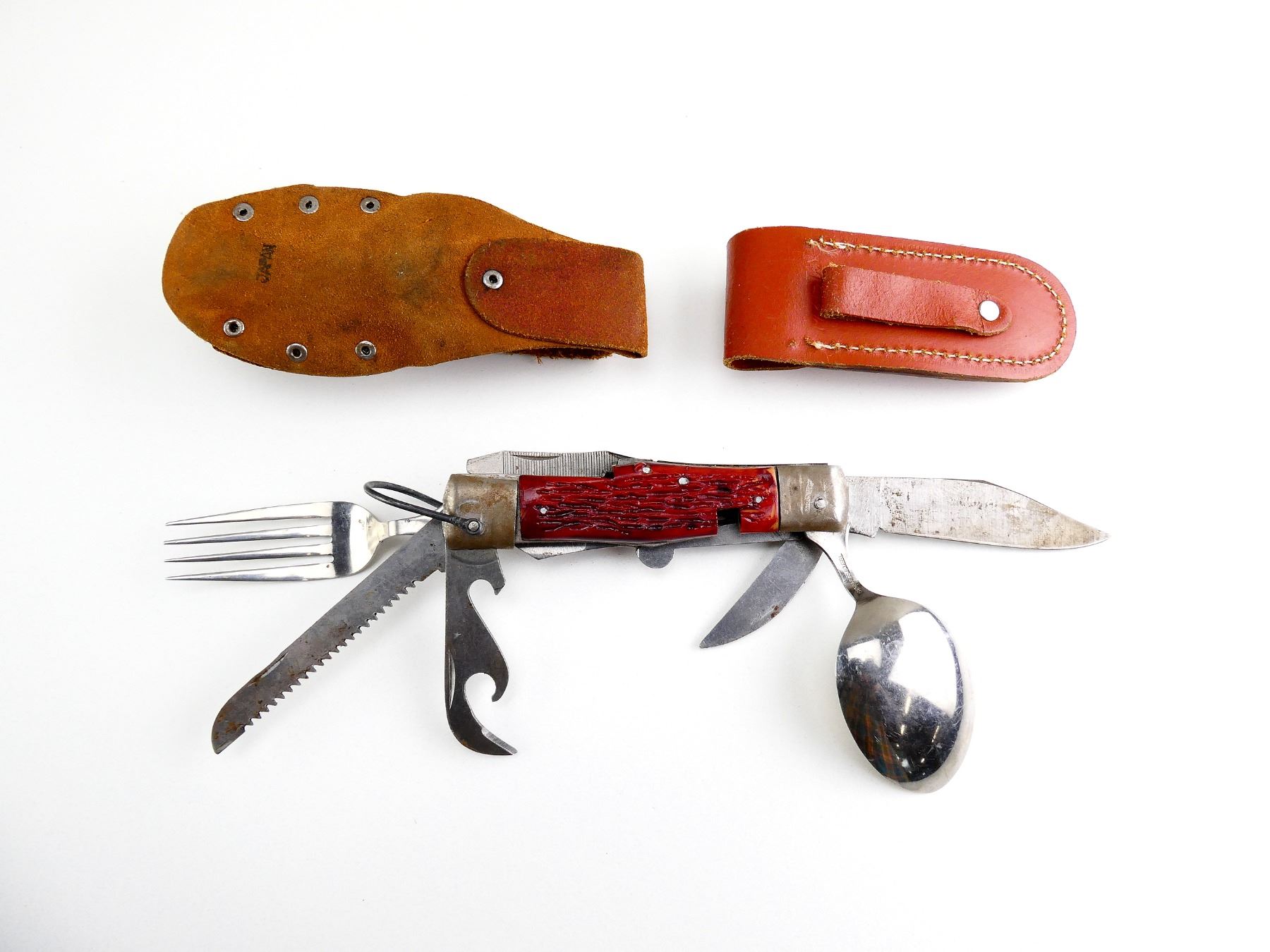 (1) STEEL FOLDING BLADE WITH STEEL FOLDING FORK / SPOON / MULTI-TOOL / ETC., MARKED: "JAPAN", WITH BROWN & METAL SHEATH, BLADE APPROX. 4", OAL APPROX. 8.75" & (1) SMALL BROWN LEATHER FOLDING POCKET KNIFE SHEATH ONLY, MARKED: "PAKISTAN". SEE PHOTOS.