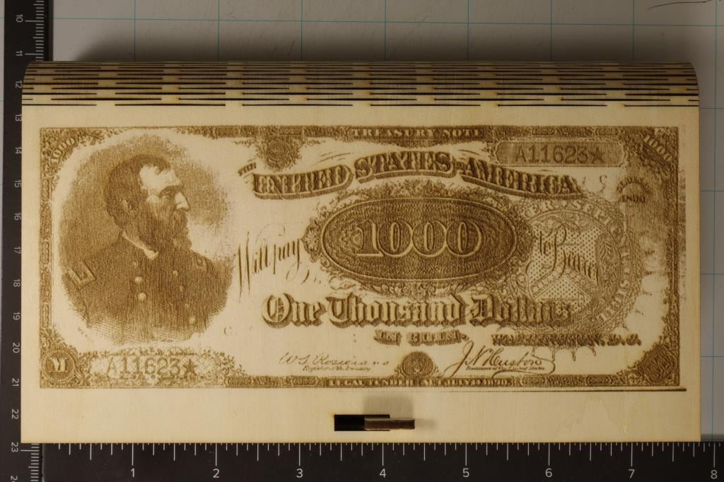 A US $1000 TREASURY NOTE, LOCKING LID 7 1/2'' X 4 1/2'' X 1 1/4". NICE PIECE. ASK US ABOUT ENGRAVING CUSTOM WORDING OR PICTURES FOR SPECIAL OCCASIONS LIKE BIRTHDAY OR HOLIDAY GIFTS, COMPANY FUNCTIONS, AWARDS OR ANYTHING