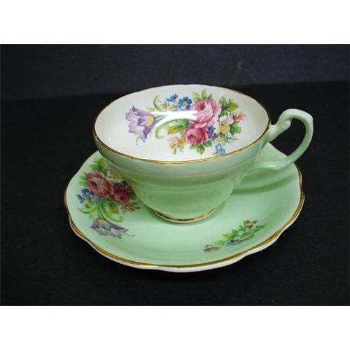 BEAUTIFUL PEDESTAL TEA SET, MADE IN PRETTY FLORAL AND PASTEL GREEN BACKGROUND BY FOLEY BONE CHINA ENGLAND,ENTITLED - FOLEY TULIP - Excellent condition, US Buyer please remit 7.00 for shipping plus insurance.THANKS.
