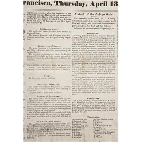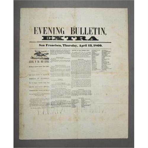 <B>BROADSIDE ANNOUNCING THE FIRST “ARRIVAL OF PONY EXPRESS”, SAN FRANCISCO, CALIFORNIA, EVENING BULLETIN 1860</B></I><BR><BR>Documents one of the most important moments in western history when announced in San Francisco, Thursday, April 13, 1860. Arrival of the Pony Express. “13 days later from New York”. <I>“The great Overland Pony express, via Salt Lake, arrived this afternoon, at half-past three o'clock, at Carson City, in Western Utah”.</B></I> (Nevada).<BR><BR><I>“The following summary comprises all news of importance after the departure of the Butterfield Overland Mail, which took out exclusive telegraphic dates March 20th, and is made up expressly for the Central Overland Pony Express which will leave St. Joseph's on the 3rd of April, at 5 o'clock P.M”.</B></I><BR><BR>The first westbound Pony left St. Joseph, Missouri at 6:30 P. M. on April 3rd, 1860. It arrived at Salt Lake on April 9th, 6:30 P. M., Carson City April 12th, 3:30 P. M., Placerville April 13th, 1:55 P. M., Sacramento April 13th, 5:25 P M., thence by boat to San Francisco, arriving there on April 14th, 12:38 A. M. Elapsed time was 10.5 days.<BR><BR>This newspaper broadside "extra" announcing the arrival of the Pony Express in the Territory of Utah is the first news of the Pony Express from St. Joseph, Mo. to San Francisco, Ca. on the Western Front. 12.5”x 14.75”. This is a very rare broadside and the greatest Pony Express that exists.<BR><BR><B>Condition:</B></I> It has moderate off-setting and mild browning, repaired tear, otherwise in fine condition.<BR><BR>Provenance: The Henry H. Clifford Collection, Oct. 25, 1994. <I>Dorothy Sloan-Rare Books</B></I><BR><BR><b>Shipping:</b> Flat Material, Small (<a target="_blank" href="http://www.heritageauctions.com/common/shipping.php">view shipping information</a>)
