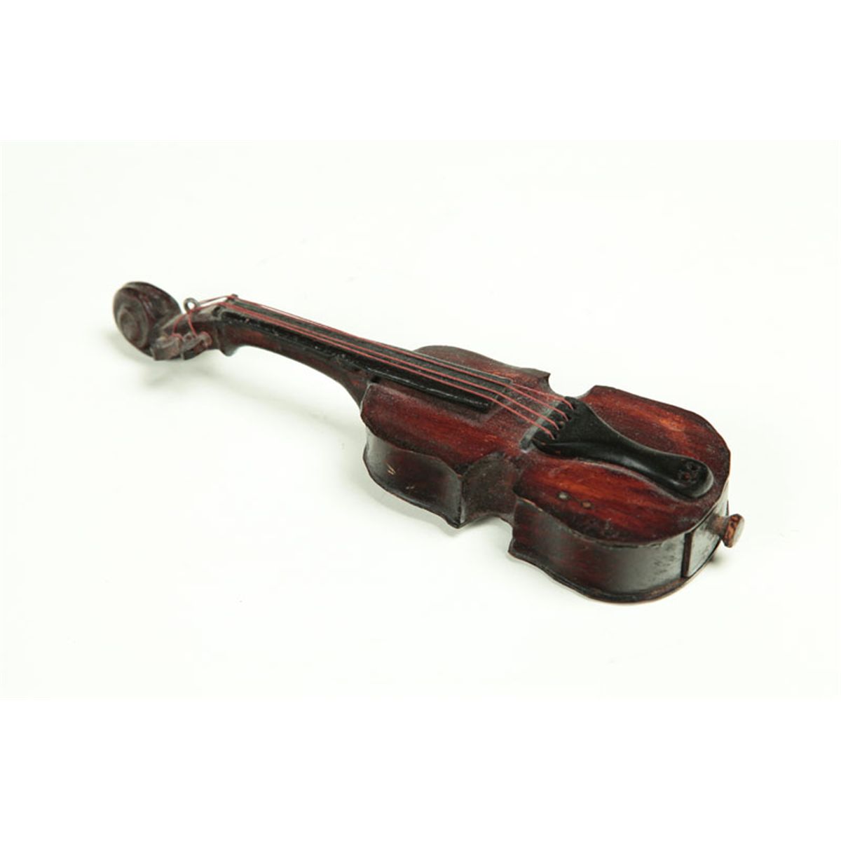 Early 20th century, mixed woods. In the form of a fiddle, with a long drawer at the end. Original varnish finish. 8 1/4"l.