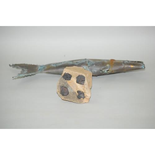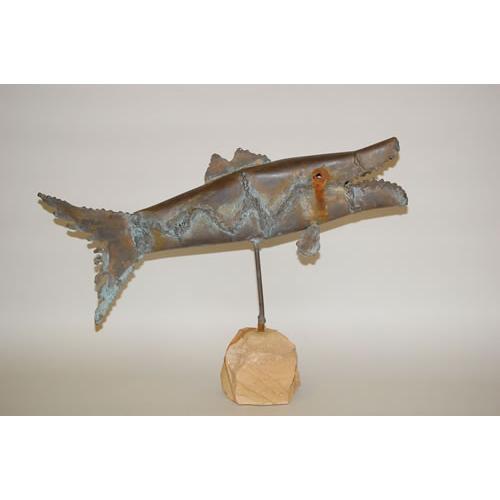 FOLK ART BRASS FISH SCULPTURE - HOLLOW BODIED WELDED BRASS FISH SCULPTURE W/ STEEL GROMMET EYES ON A NATURAL STONE BASE (14" T X 19" W) - WEAR, OXIDATION, IMPERFECTIONS