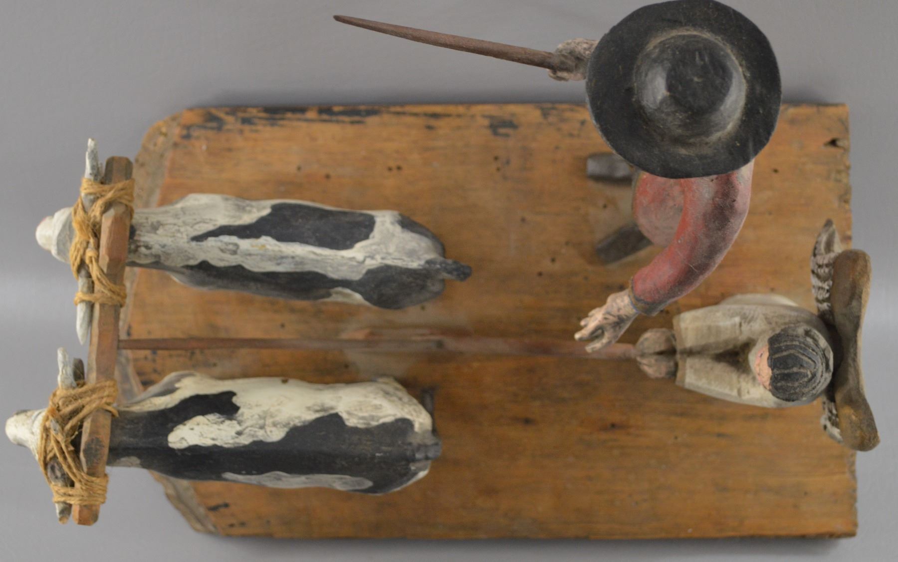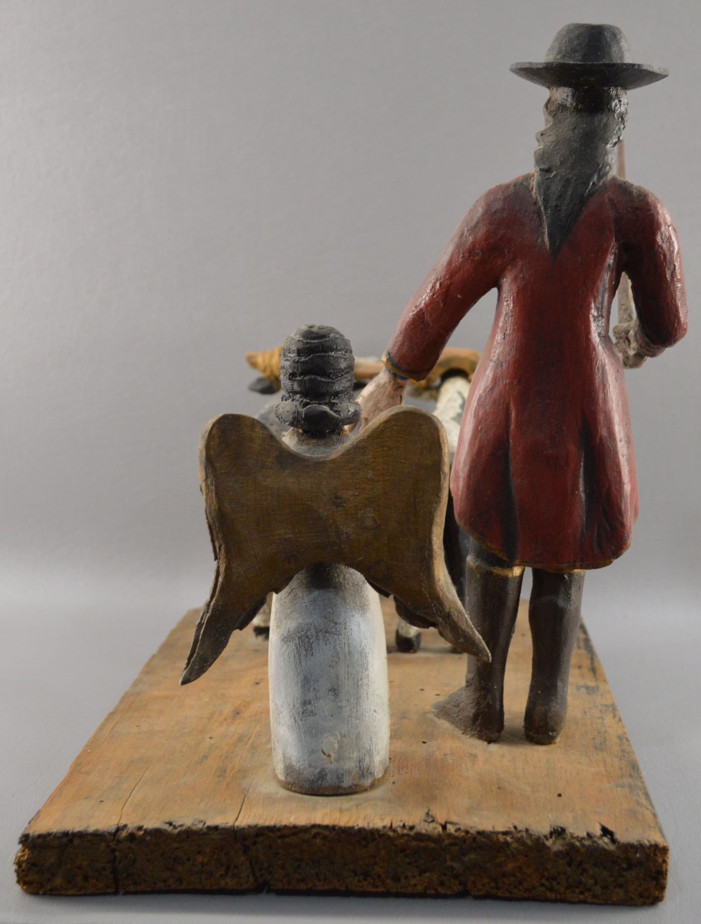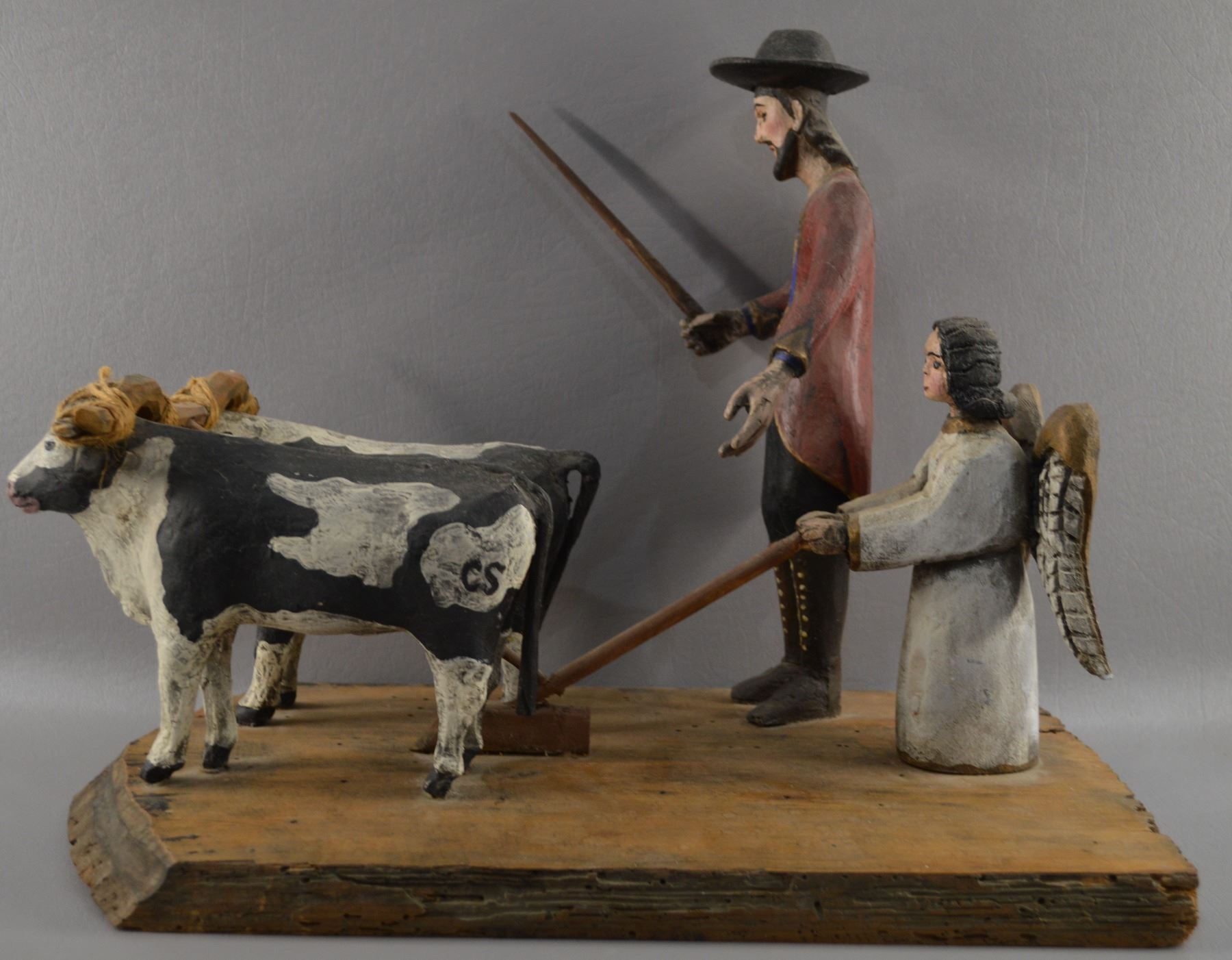 Unknown age and origin unknown. Carved and painted wood depicting man 12" tall, plowing field with help of angel 7" tall. Cows 6" tall at yolk all mounted on wooden base 15" x 9"