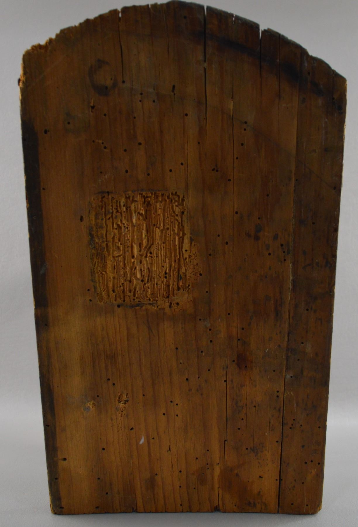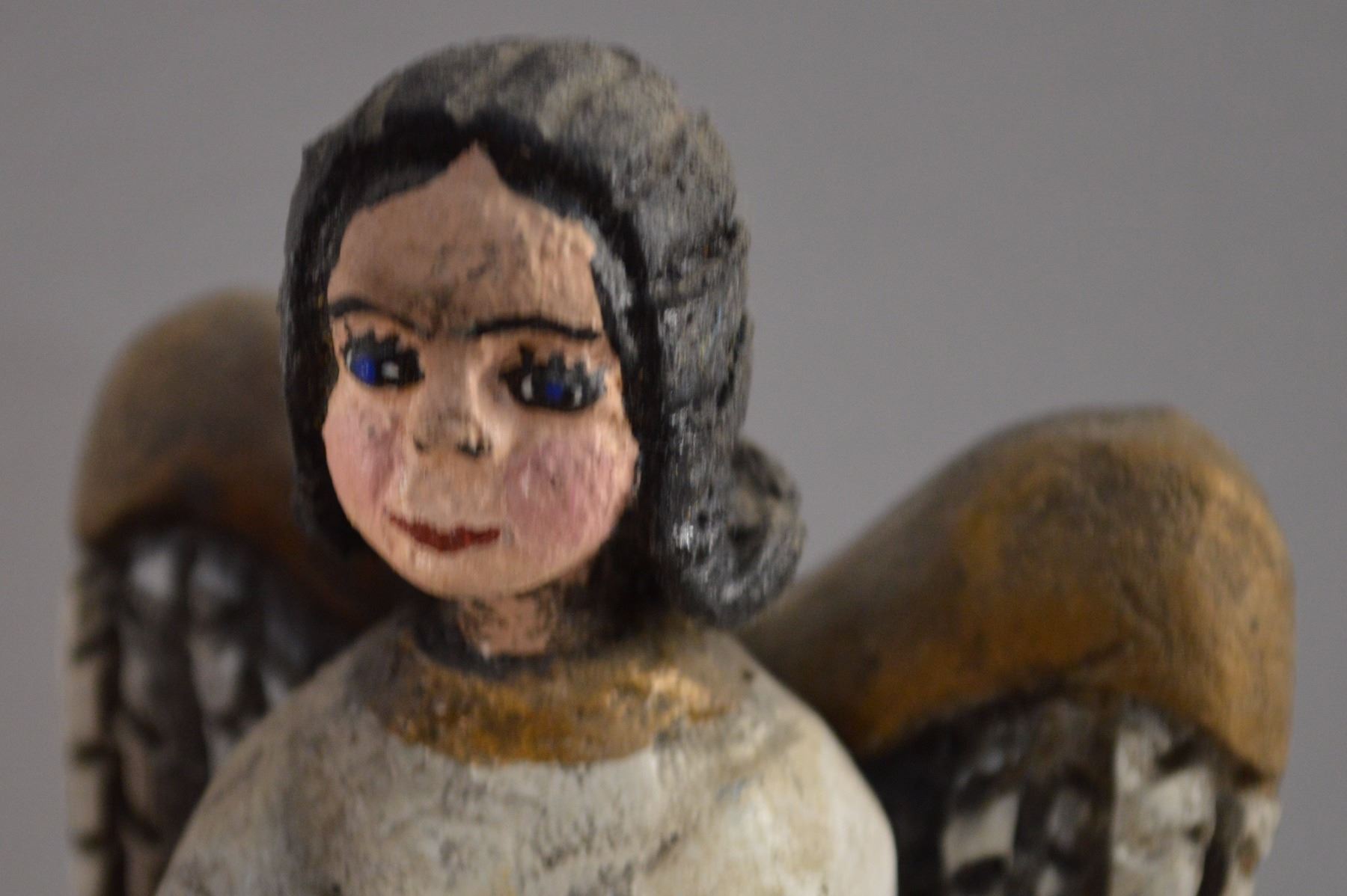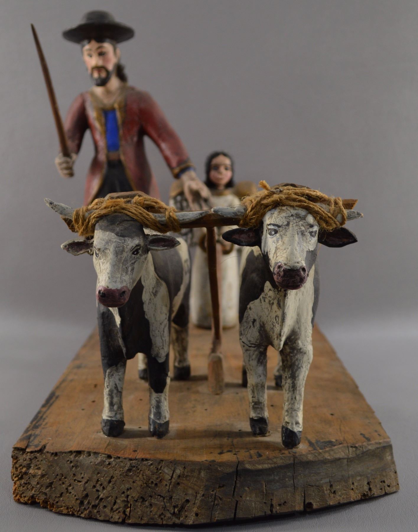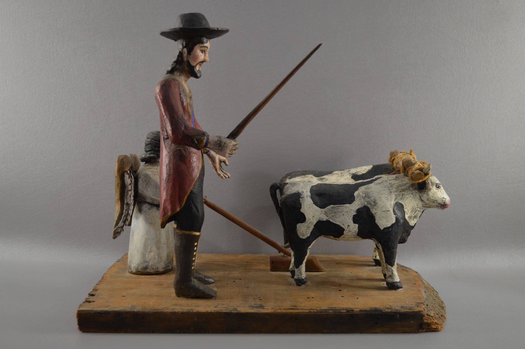 Unknown age and origin unknown. Carved and painted wood depicting man 12" tall, plowing field with help of angel 7" tall. Cows 6" tall at yolk all mounted on wooden base 15" x 9"