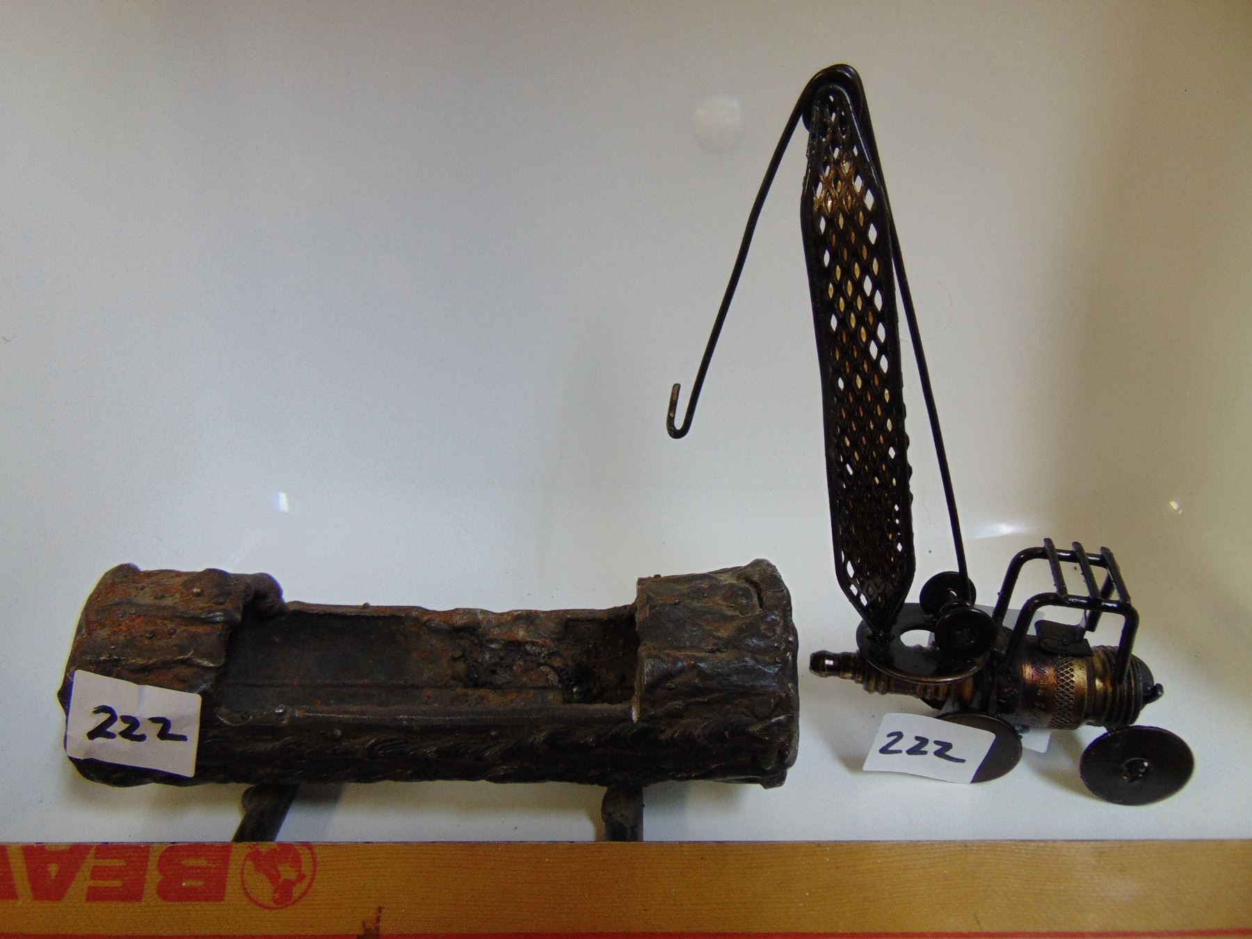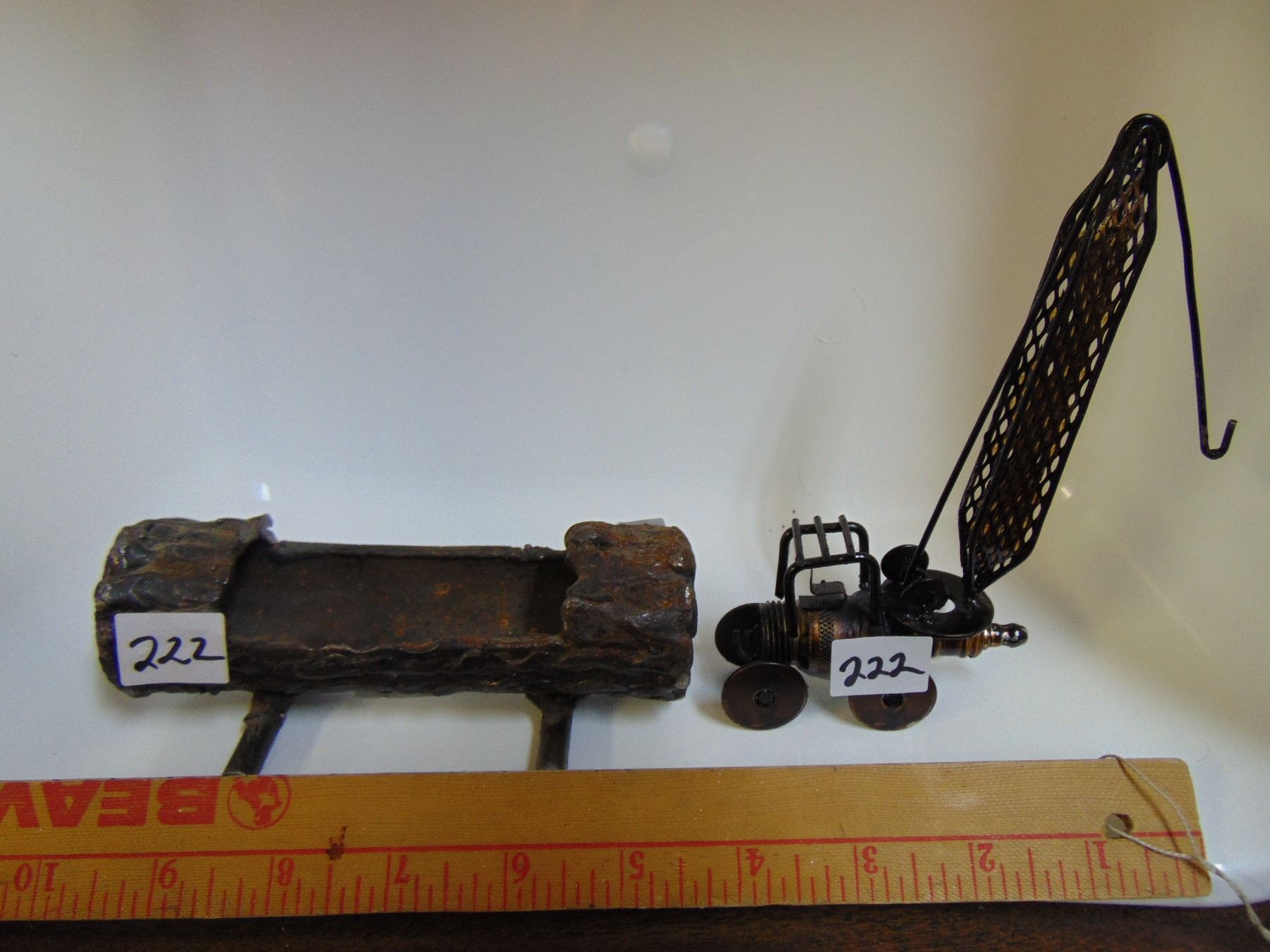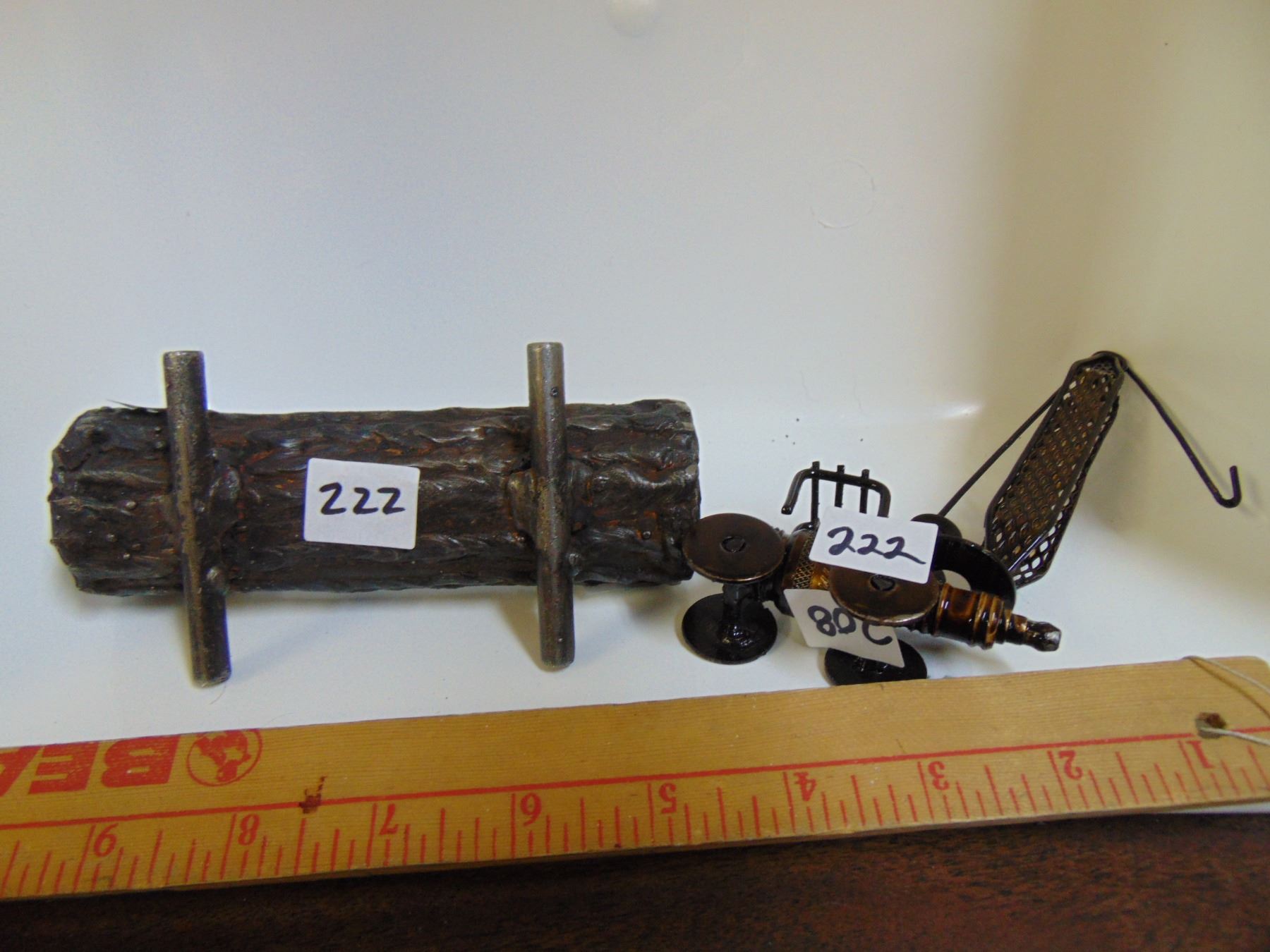 FOLK ART LOG TOOTHPICK HOLDER? AND SPARK PLUG CRANE