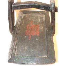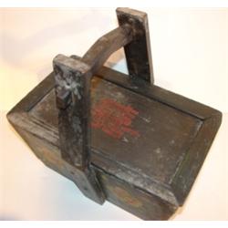 FOLK ART ORIGINAL PAINTED PIC-NIC BASKET. Original black paint with yellow painted floral decoration. Shows signs of wear. 13" H to top of handle, 13.25" L