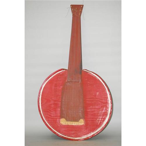 FOLK ART PAINTED 7-STRING LUTE - 20TH CENT. FOLK ART LUTE TYPE INSTRUMENT MADE FROM AN 18 1/2" 19TH CENT. TURNED WOODEN BOWL COVERED W/ A PLYWOOD SOUND BOARD & NOTCHED TO RECEIVE AN AD HOC NECK IN RED, WHITE & BLACK PAINT (34" L) - WEAR, IMPERFECTIONS
