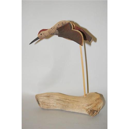 FOLK ART PAINTED TIN SHOREBIRD DECOY - 20TH CENT. FOLK ART PAINTED TIN SHOREBIRD IN FLIGHT DECOY W/ DETACHABLE BALANCED WINGS W/ REALISTIC PAINTED POLYCHROME PLUMAGE ON A DRIFTWOOD BASE (16 1/2" T X 13" WINGSPAN) - WEAR, IMPERFECTIONS