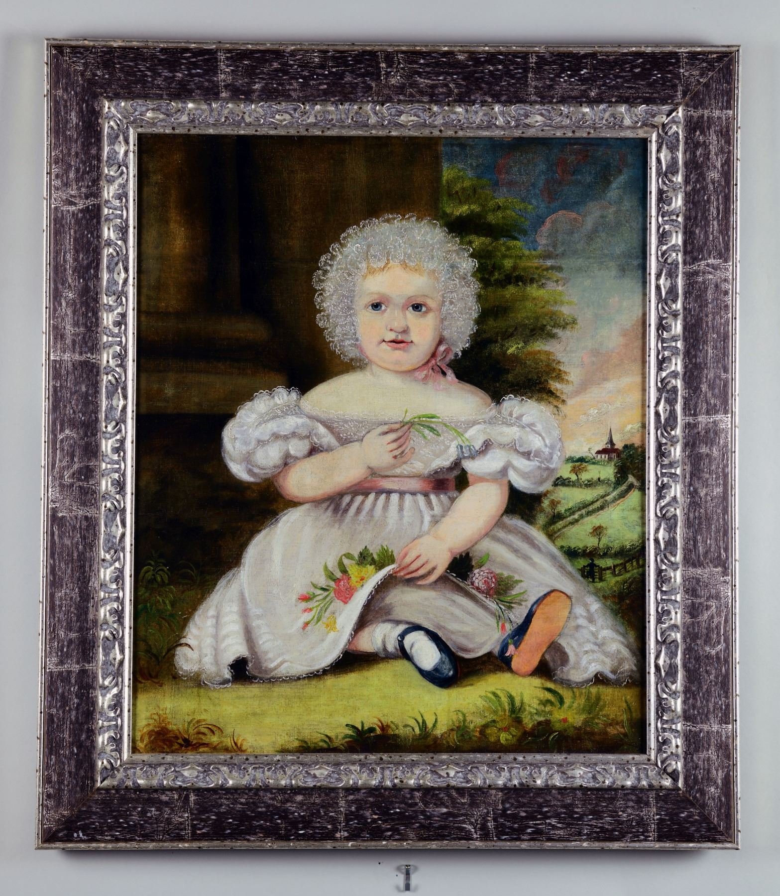 In the manner of Jan Adam Kruseman (Dutch, 1804-1862). European School. Oil on board depicts a girl in white dress and bonnet, all trimmed in lace, seated on the ground with a spray of flowers in her lap within a country landscape. Housed in a silver wood frame with gesso surround. SIZE: overall 31" x 27", sight 23 1/2" x 19 1/2". CONDITION: professionally cleaned, likely laid down on board. Horizontal fold marks are visible. PROVENANCE: from a Pennsylvania Estate Collection. (05-846/TG). $800-1,200.