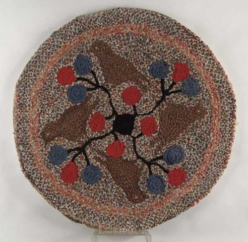 FOLK ART ROUND HOOKED RUG. Interesting design with four birds and with branchlike design with blue and red circles which may be fruit or flowers. An outer red striped mottled border with the other background being a kaleidoscope of print fabrics. Circa 1920. SIZE: 35-1/2” dia. CONDITION: Good, mounted on foam board. 9-26424